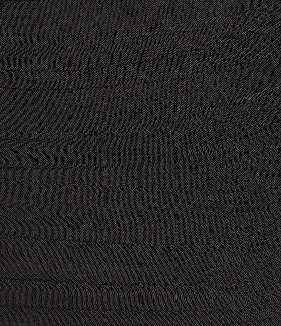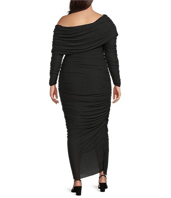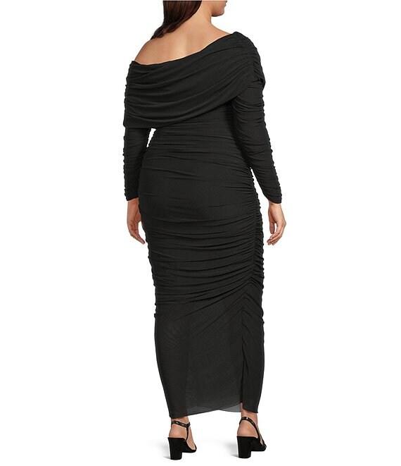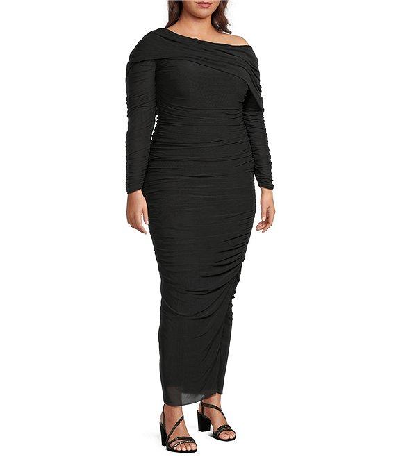 From Betsy & Adam Plus, this dress features: Mesh fabrication Bodycon gown silhouette One shoulder Long sleeves Ruching Side zip closure Approx. 63" length Polyester Dry clean Imported.