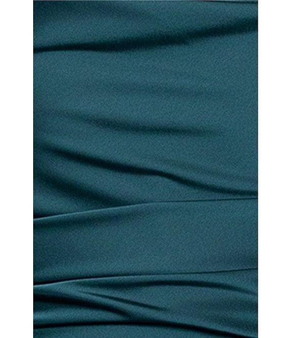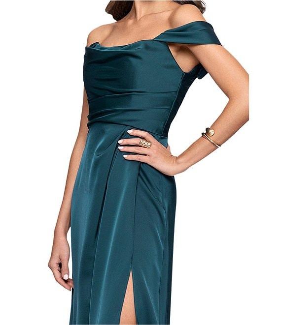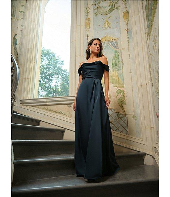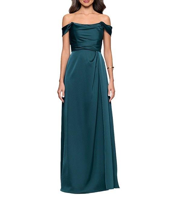 Betsy & Adam Satin Ruched Off The Shoulder Gown