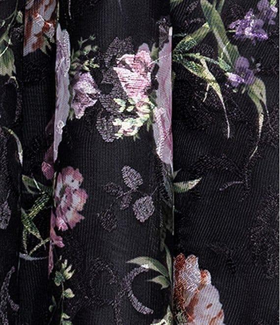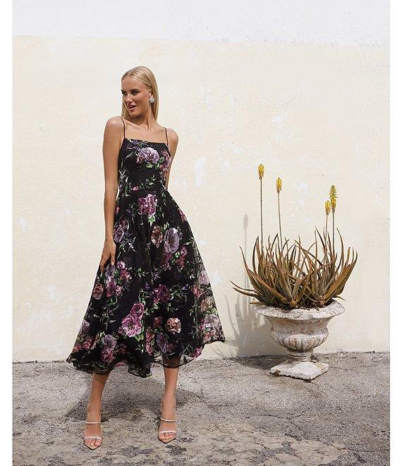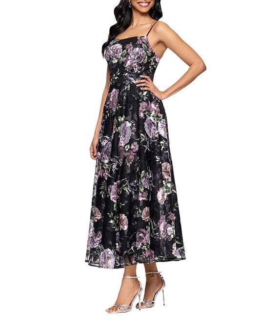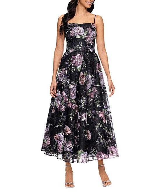 Betsy & Adam Square Neck Floral Print Embroidered Mesh Fit & Flare Midi Dress