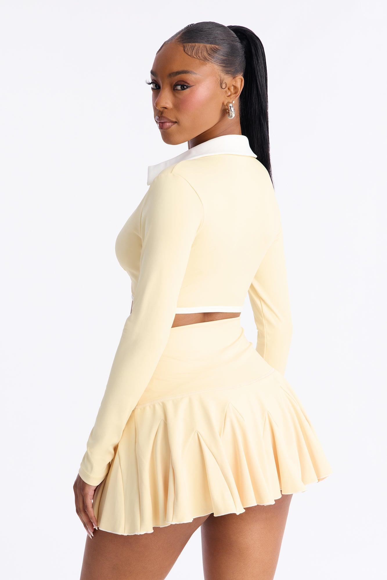 Available In Black And Yellow. 2 Piece Ensemble Top And Skirt Set Stretch Long Sleeve Bra Pads Shorts Lining Flowy Skirt 14" Length Top Shell, Contrast Lining 1 : 80%Polyester 20% Spandex Top Lining 2: 92% Nylon 8% Spandex Bottom Shell & Lining: 80%Polyester 20% Spandex Imported