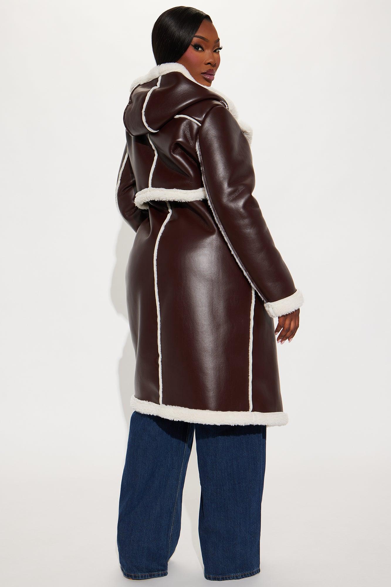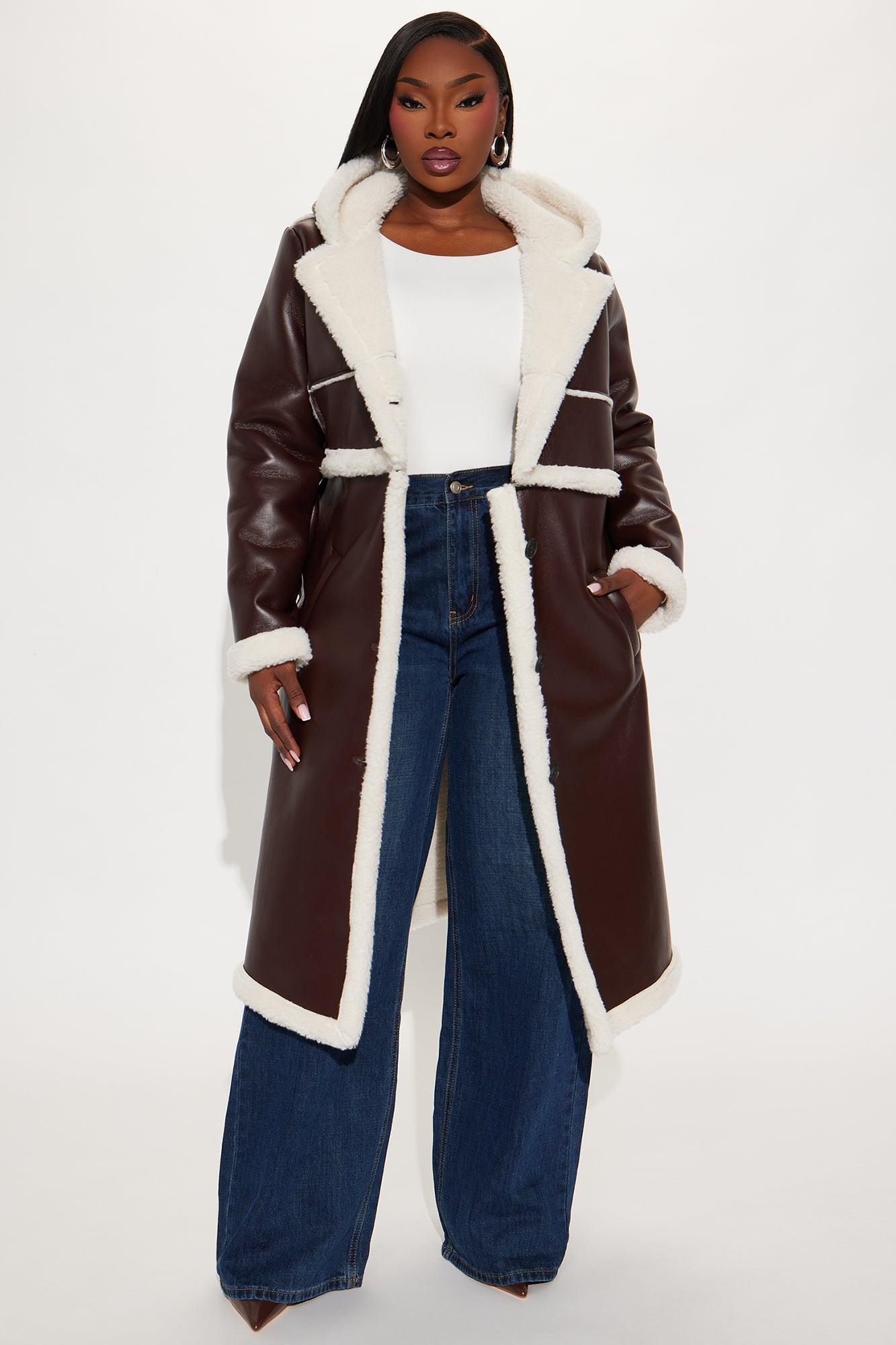 Available In Black/Brown, Black/Pink And Chocolate. Trench Coat Collar Long Sleeve Faux Leather Sherpa Trim Fully Lined Shell Facing: 100% Polyurethane Backing: 100% Polyester Faux Fur: 100% Polyester Imported California Proposition 65WARNING: Cancer and Reproductive Harm - www.P65Warnings.ca.gov.