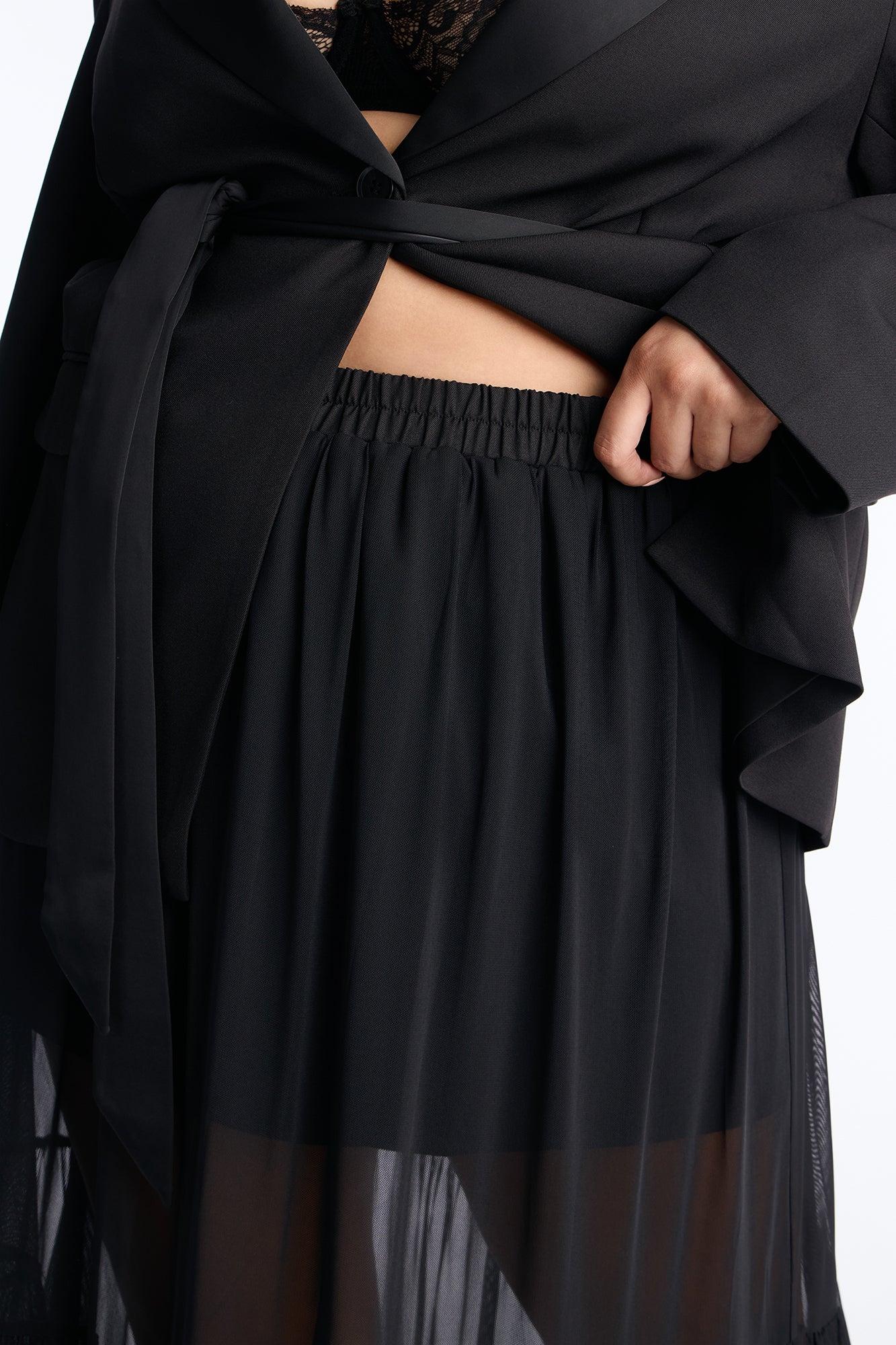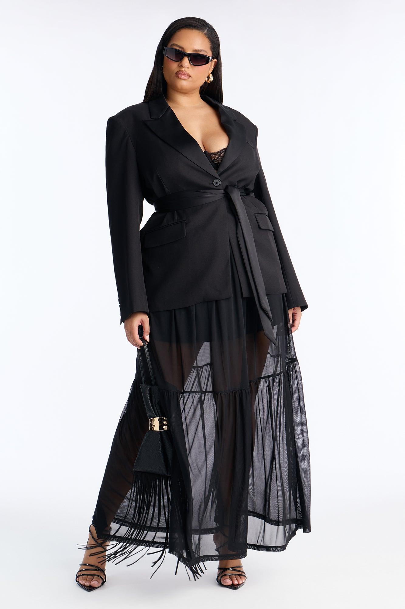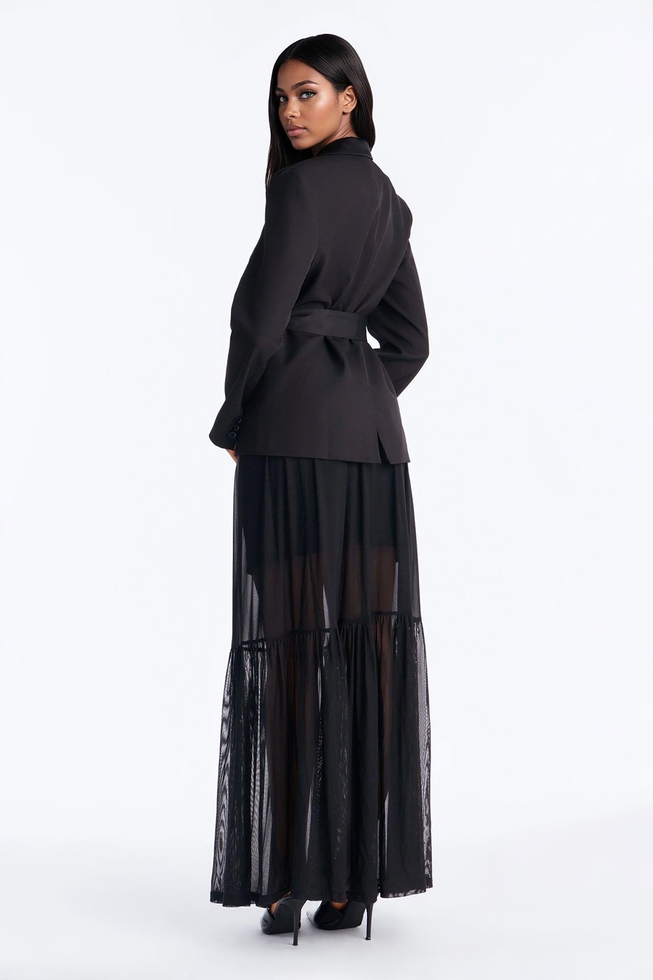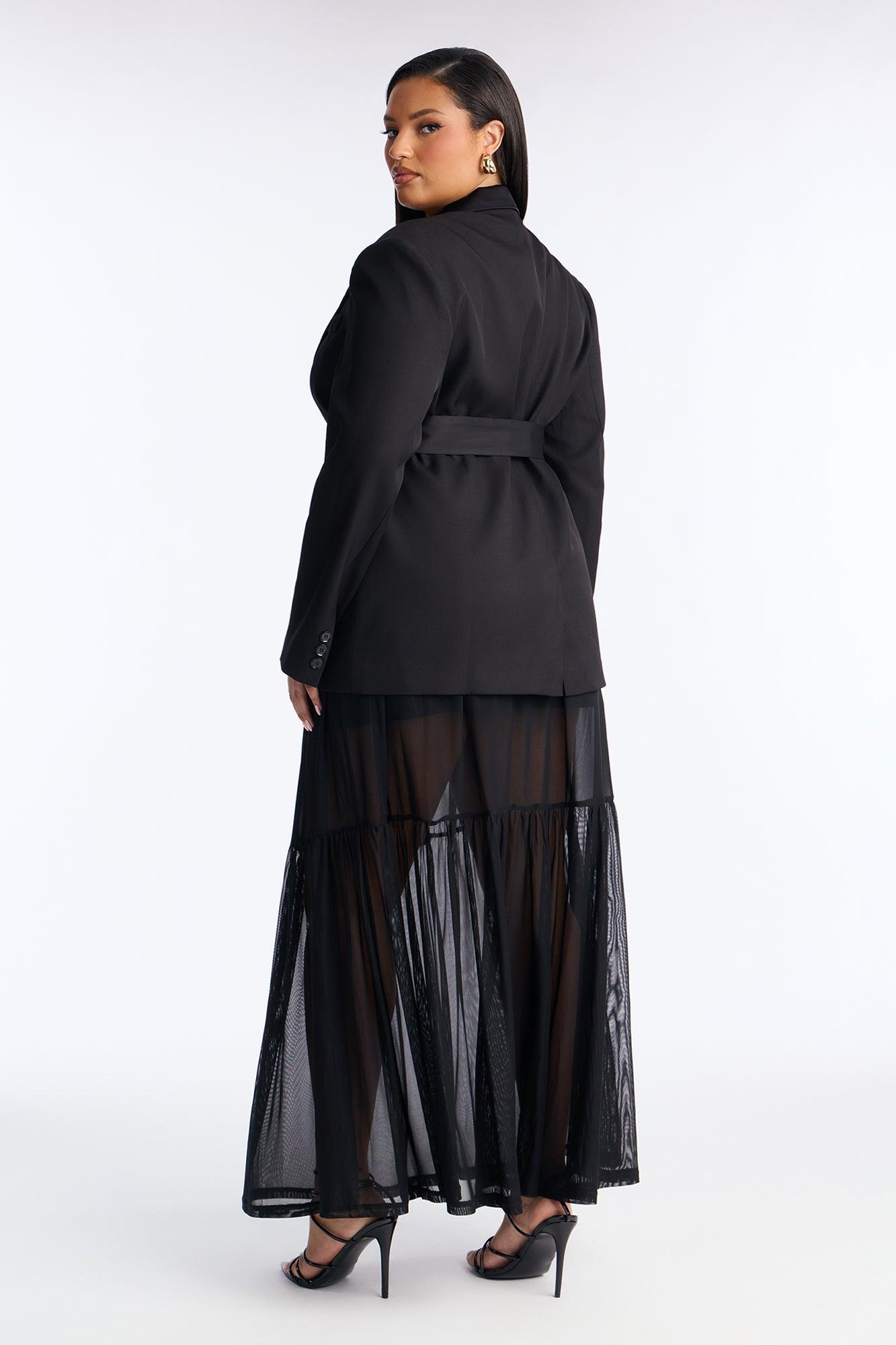 Available In Black. 2 Piece Ensemble Blazer And Maxi Skirt Set Moderate Stretch Collar Neck Tie Waist Detail Mesh Maxi Skirt Elastic Waistband Undergarment Lining Top: 97% Polyester 3% Spandex Contrast: 100% Polyester Lining: 100% Polyester Bottom: 95% Polyester 5% Spandex Lining: 97% Polyester 3% Spandex Imported