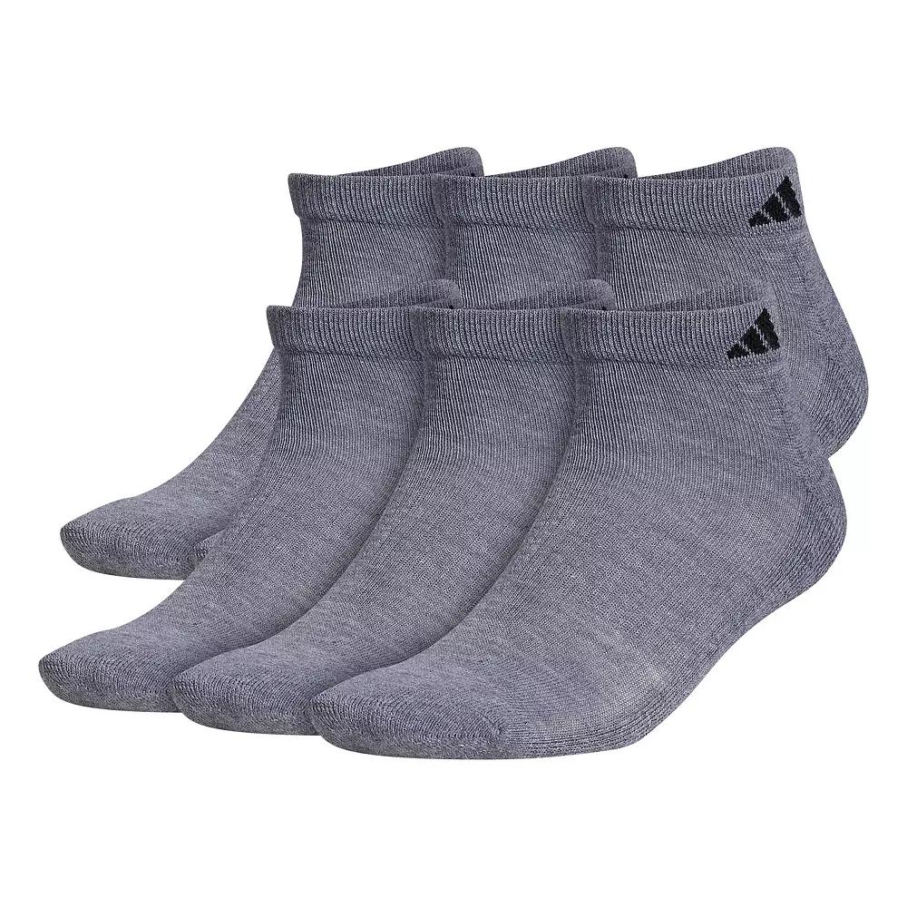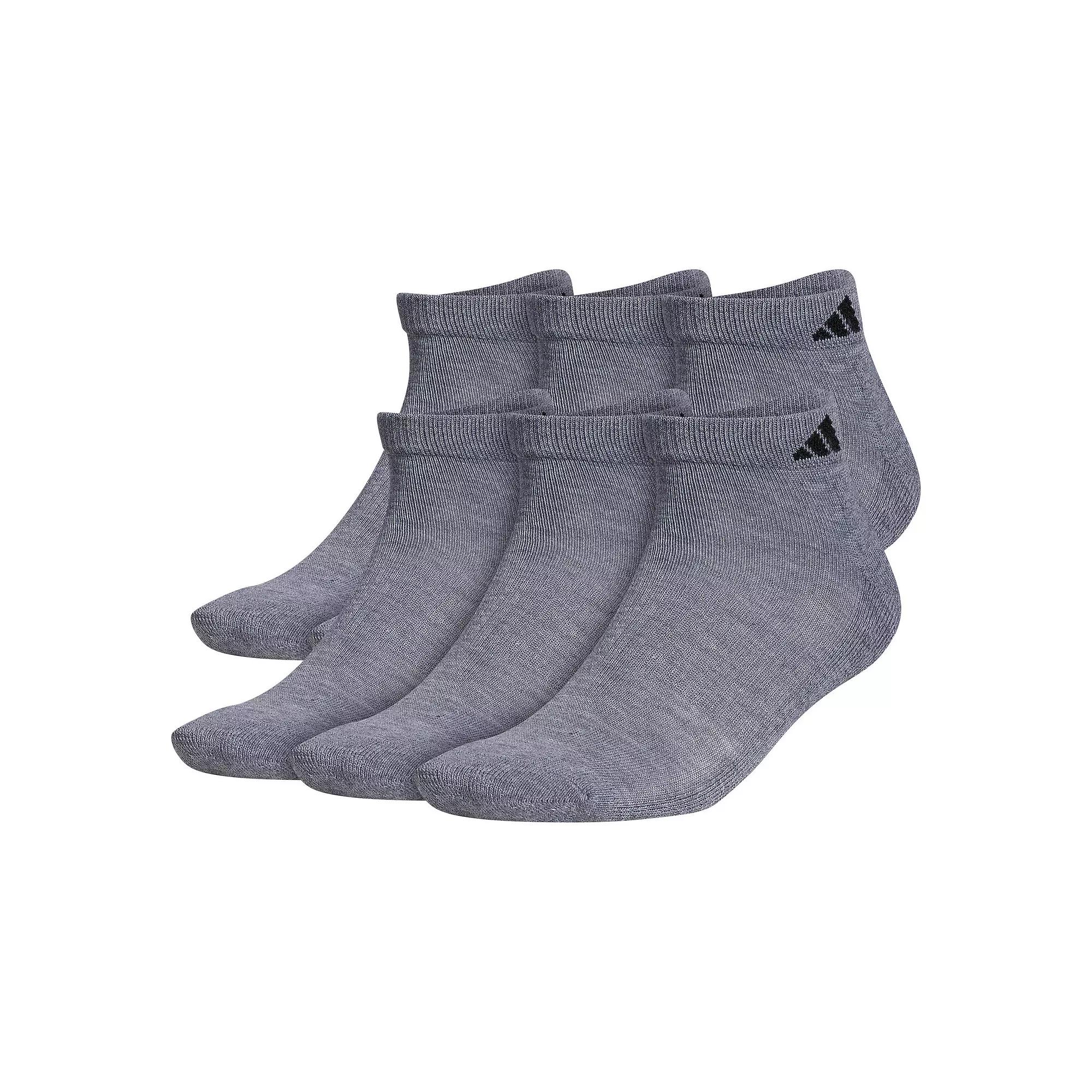Comfort zone. Step up your game in these men's adidas cushioned socks. Click on this MEN'S GUIDE to find the perfect fit and more! - https://www.kohls.com/feature/mens-apparel-guide.jsp. 6-pack. Cushioned. Moisture-wicking technology keeps feet dry & cool. FIT & SIZING: Low-cut silhouette. FABRIC & CARE: Polyester, cotton, natural latex rubber, spandex. Machine wash. Imported. Size: 8-12. Color: Gray. Gender: male. Age Group: adult. Pattern: Solid. Material: POLY BLEND.