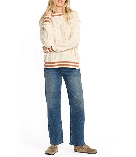 From Billabong, this sweater features: Open stitch weave Round neckline Long sleeves Pullover styling Striped neckline, cuffs and hem Signature metal plate Relaxed fit Breathable cotton/acrylic/nylon loose-knit jersey Hand wash/line dry Imported.
