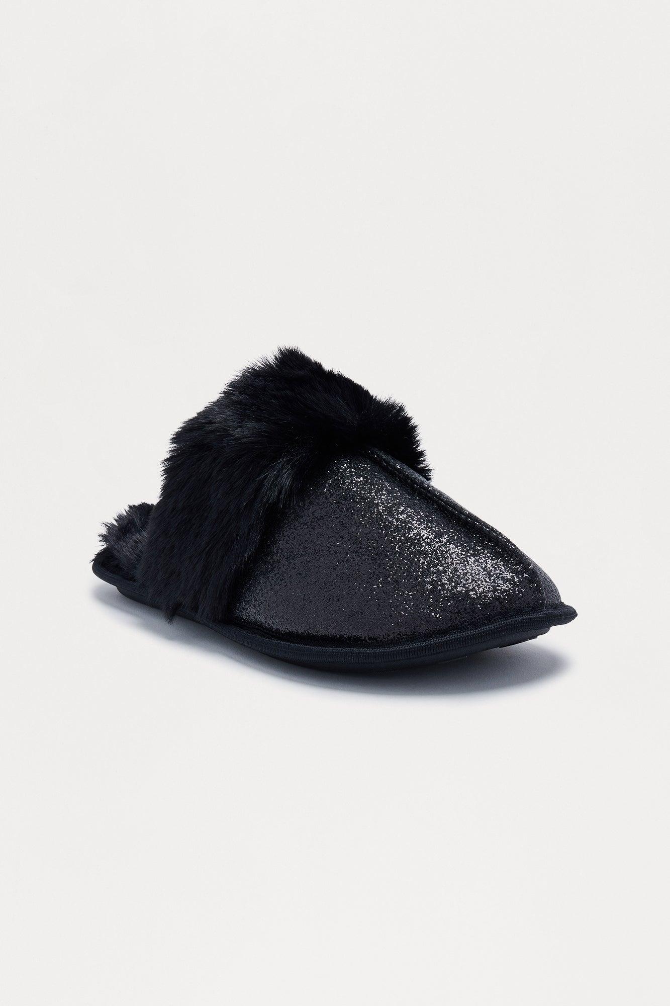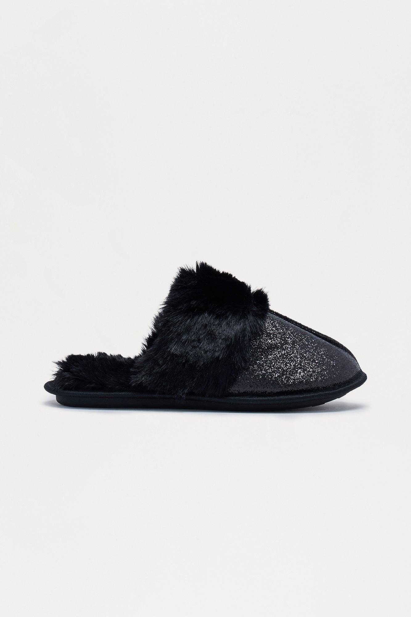 Bizzy Fur Trim Glitter Slippers - Black Female