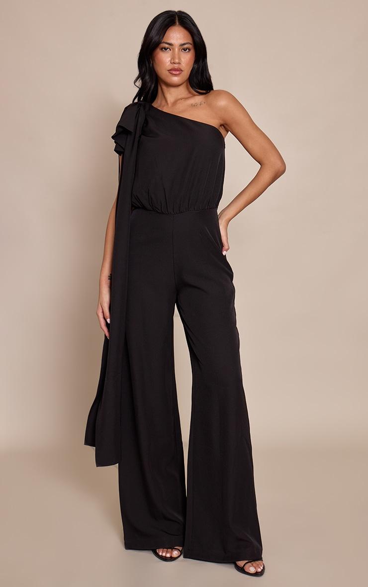 Sleek and impactful, the black bow detail one shoulder straight leg jumpsuit is your ultimate evening pick. This black design boasts an elegant one-shoulder neckline with a distinctive bow detail and a confident straight leg cut. Secure your spotlight moment at any upcoming evening engagement. Style yours with sharp high heels and striking gold jewelry for an undeniable finish.Length approx 155cm/61inch (Based on sample size US 4)Model wears size UK 8/ EU 36/ AUS 8/ US 4Model Height - 5ft 6inchp]:!mb-4inch>Brand: PrettyLittleThingCategory: DressesProduct type: Wide Leg JumpsuitColor: BlackMaterial: Tailored WovenOccasion: Evening
