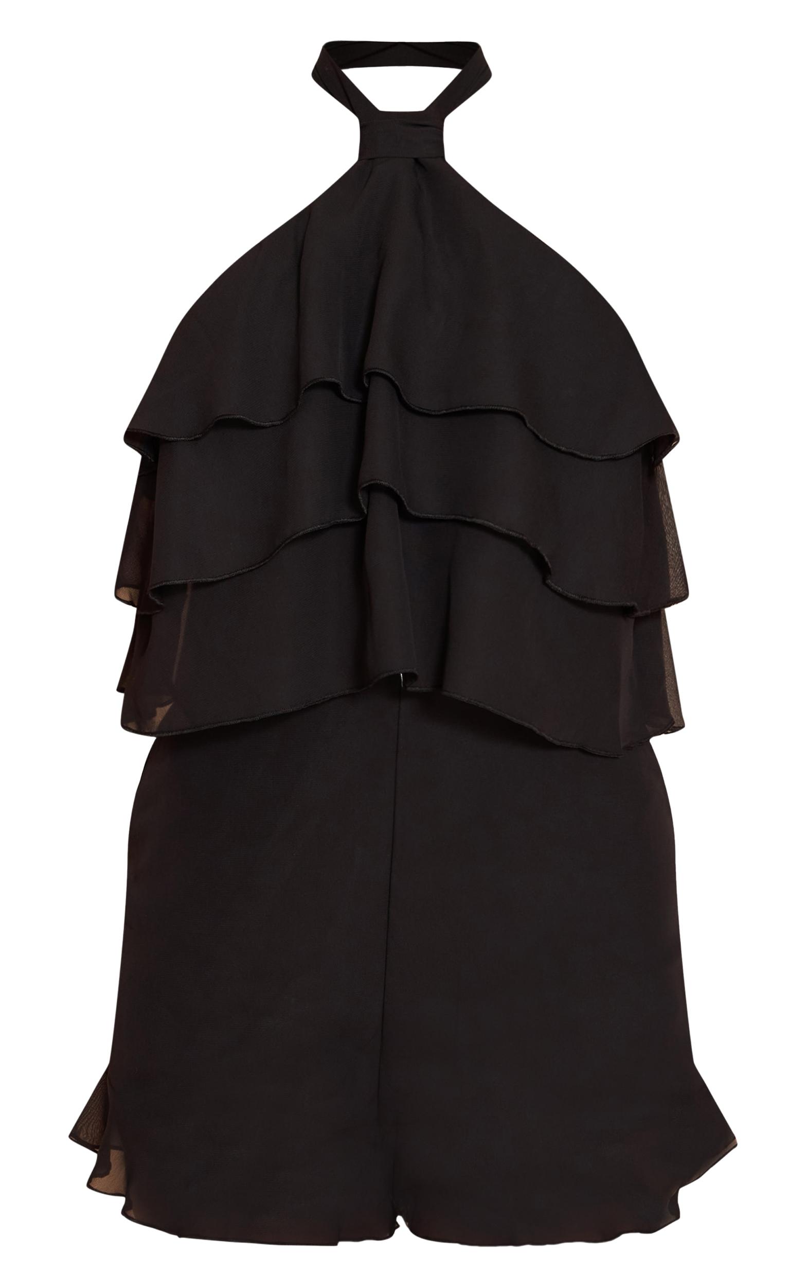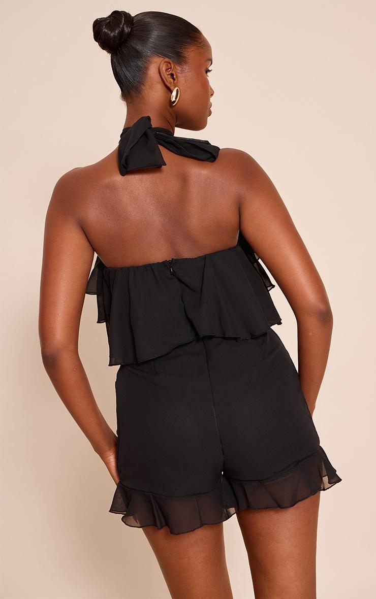 Step into your evening moment with the black chiffon halter neck frill romper, a design that speaks to confident individuality. The distinctive halter neckline creates a clean, bold line, extending into a multi-tiered frill overlay that drapes with refined charm. The romper's shorts then feature a delicate, understated frill at the hem, adding a final touch of considered detail. For a high-impact evening presence, pair this romper with slender heeled mules and a structured mini bag, letting minimal jewelry enhance its effortless appeal.Length approx 81.5cm/32inch (Based on sample size US 4)Model wears size UK 8/ EU 36/ AUS 8/ US 4Model Height - 5ft 9inchp]:!mb-4inch>Brand: PrettyLittleThingCategory: DressesProduct type: Floaty PlaysuitColor: BlackMaterial: ChiffonNeckline: HalterneckSleeves: SleevelessOccasion: Evening