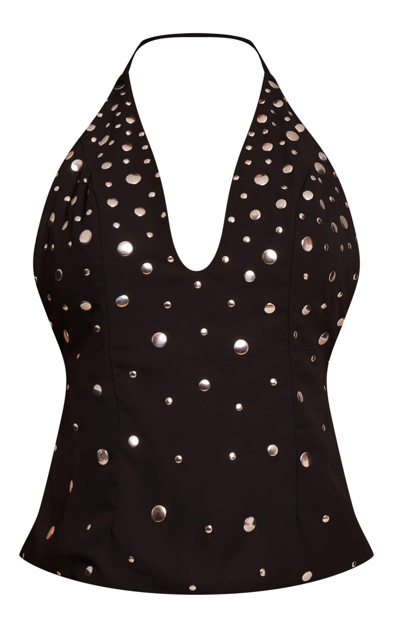 Step into the night with the black chiffon studded halterneck top. Crafted from chiffon, its striking halter neckline, plunging V-front, and all-over stud detailing make an undeniable statement. Command the spotlight on your next night out. Pair with sleek tailored pants, sharp gold heels, and subtle beaded bracelets for an impactful ensemble.Length approx 48.5cm/19inch (Based on sample size US 4)Model wears size UK 8/ EU 36/ AUS 8/ US 4Model Height - 5ft 6inchp]:!mb-4inch>Brand: PrettyLittleThingCategory: TopsProduct type: Cami TopColor: BlackMaterial: ChiffonOccasion: Evening