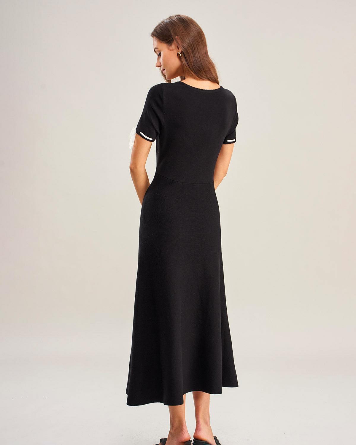 Description: Embody effortless sophistication with our Elegant A-Line Sweater Dress. This piece is a masterclass in polished, everyday style. Rendered in a timeless black, it's crafted from a high-quality, fine-gauge viscose-blend knit that offers a soft hand-feel and comfortable medium stretch. The design is defined by its stunning, contrasting white trim, which elegantly frames the chic U-neckline and short sleeves. This A-line silhouette is universally flattering, designed to sit at the natural waist and flare gently. Use the matching self-tie belt to cinch your waist and create a perfect hourglass shape. This is the ultimate "desk-to-dinner" staple—a versatile, curated piece that works beautifully with classic pumps for the office or sophisticated flats for a daytime event. - Occasion: Daily - Style: Elegant - Fabric Stretch: Medium Stretch - Waist: Natural Waisted - Sleeve Length: Short Sleeves - Sleeve Type: Regular Sleeve - Pattern Type: Solid - Embellishment: Contrasting colors, Tie - Neckline: U Neck - Silhouette: A-Line - Fabric: Viscose 72.0%, Polyamide 28.0% - Material: Knit