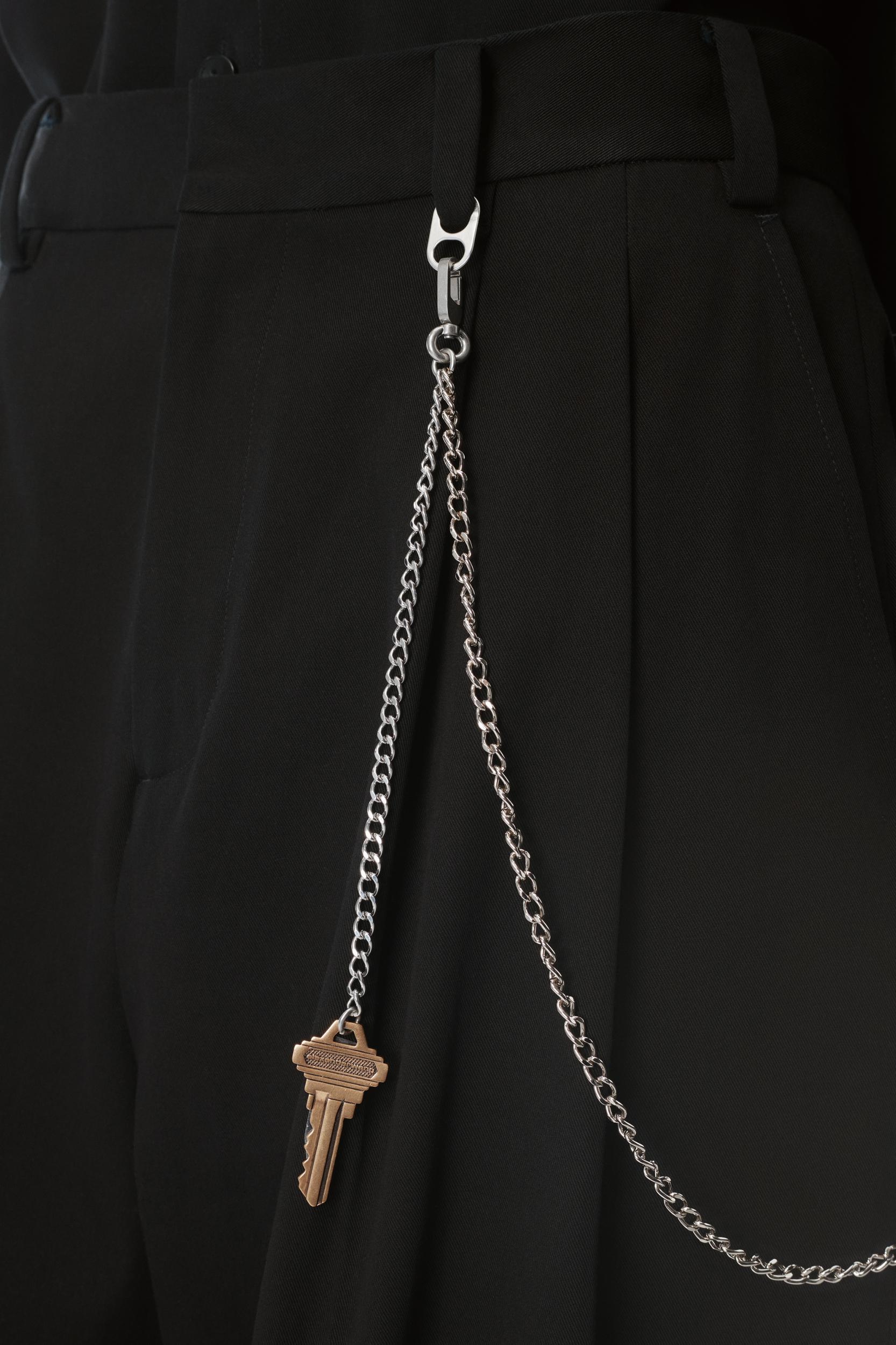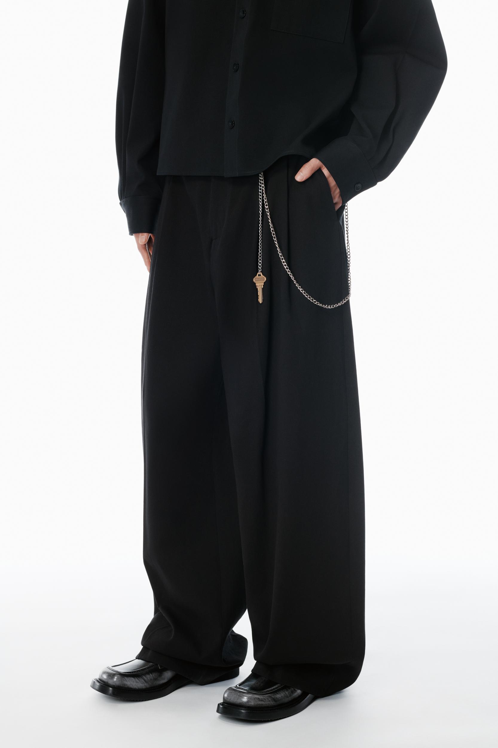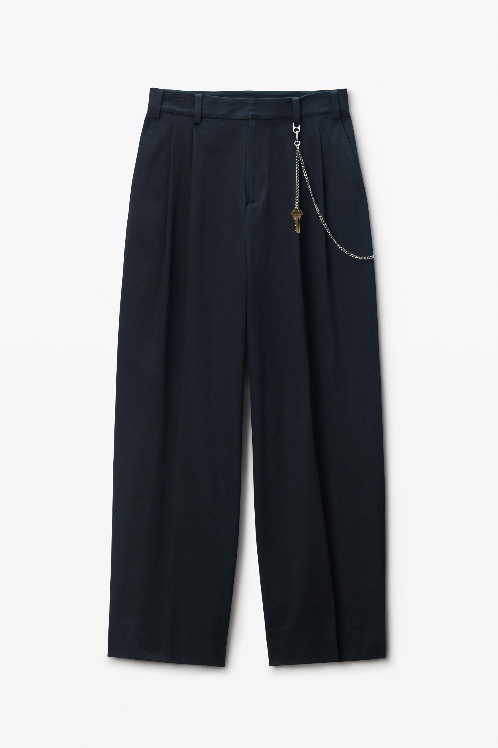 crafted from cotton twill, these relaxed-fit pants in black feature a detachable key-detailed chain at the belt loops. creasing and pleating add a tailored element, while logo embroidery completes the style.