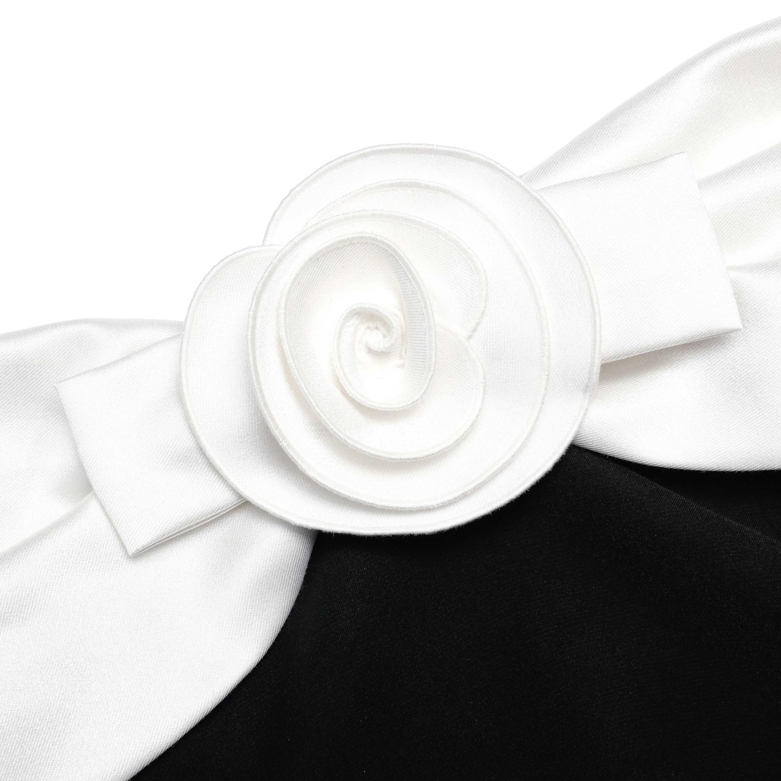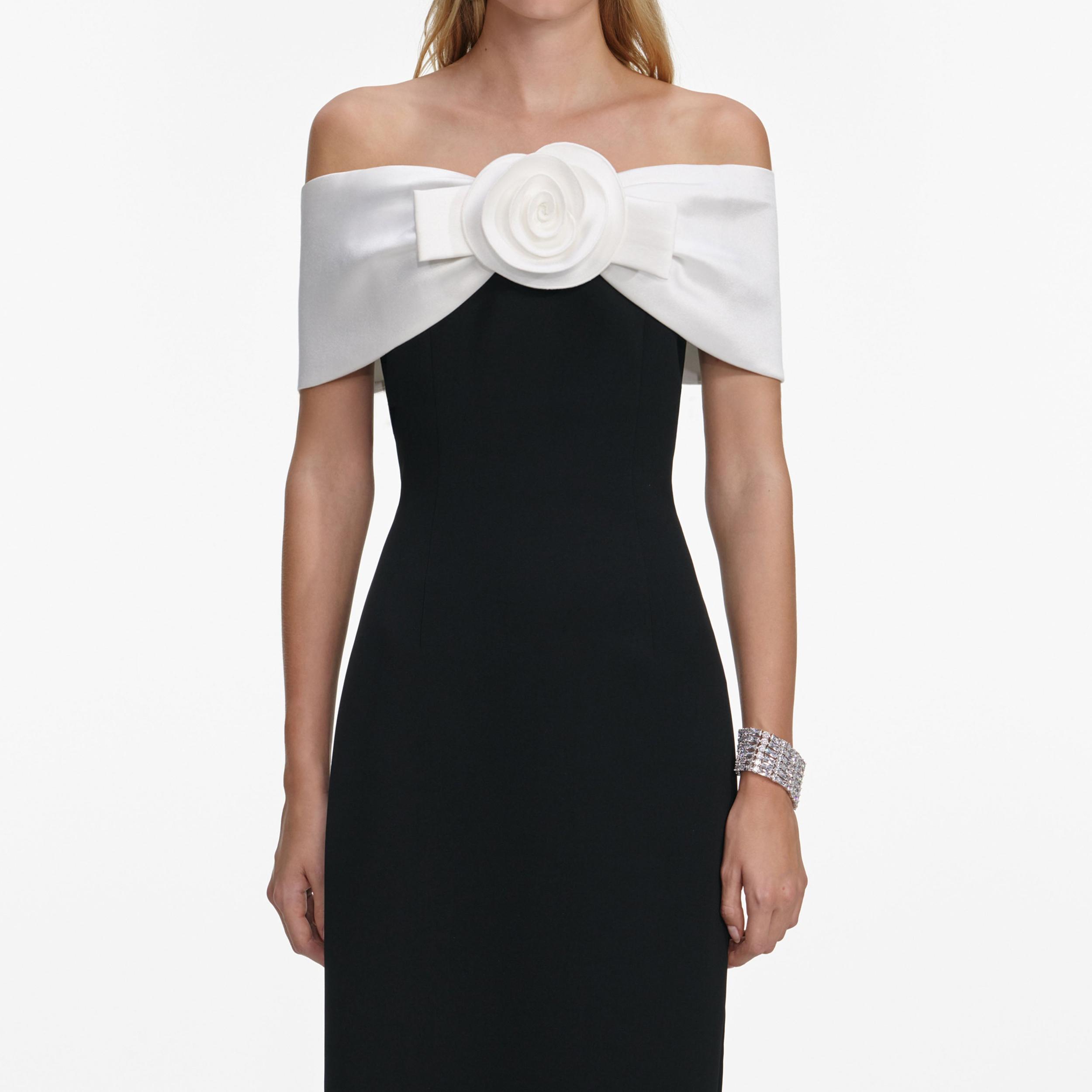 Monochrome magic: black and white meet to mesmerising effect in this column maxi dress. Topped with a sculptural corsage, it features a flattering off-shoulder wrap detail that adds a chic, feminine flourish.Fitted styleThis style has minimal stretchConcealed zip closure at backOff-shoulder necklineFloral motifModel is 5ft10/178cm and wears a size UK 6