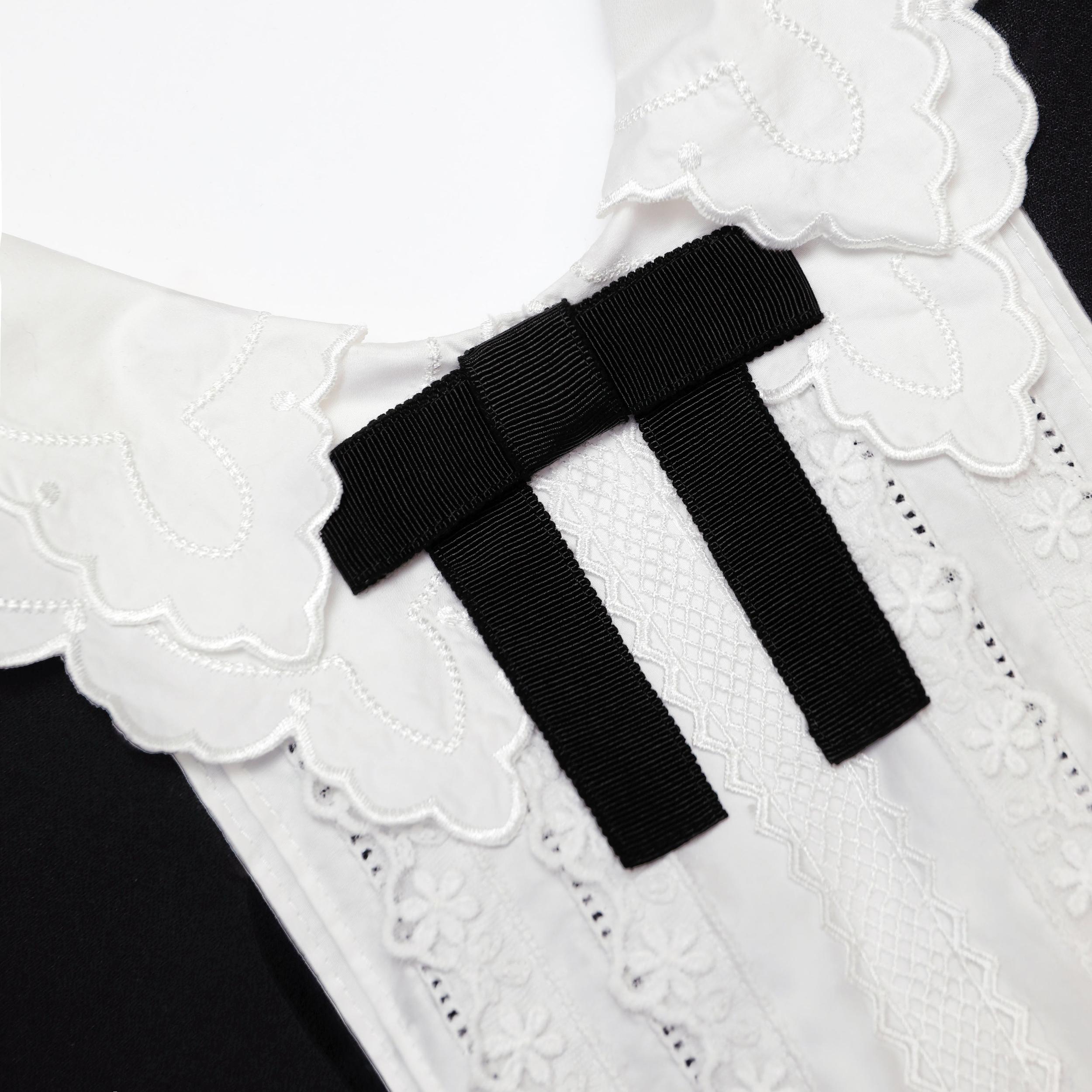 Eternally stylish, a lace bib detail lends extra polish to this black crepe mini dress. Topped with a chic bow motif, pair its feminine shift silhouette with ballet flats for nights at the opera.Fitted styleThis style has minimal stretchConcealed zip closure at backBow motif Functional pocketsModel is 5ft10/178cm and wears a size UK 6