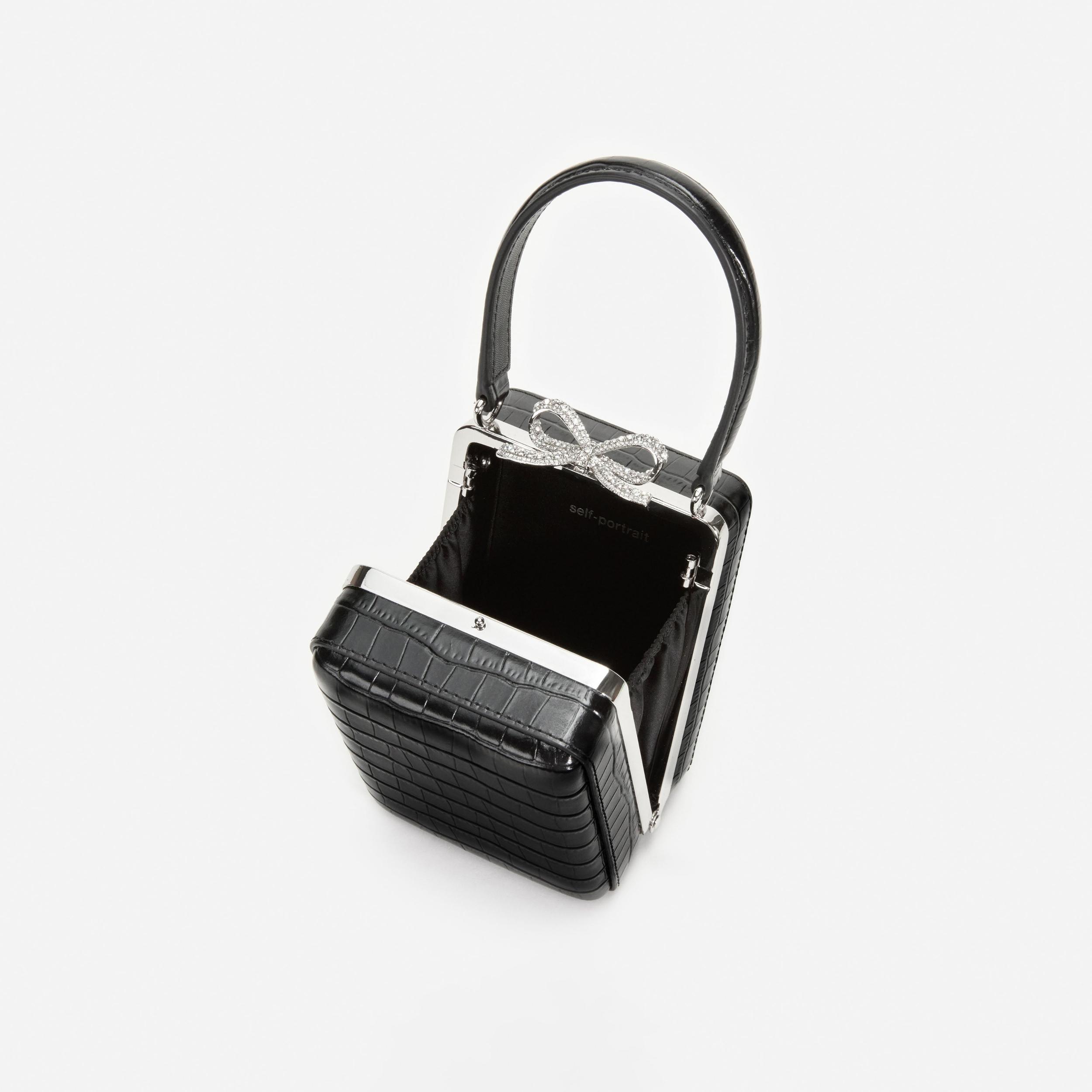 Elegant and timeless, this black mock croc leather micro bag adds a chic finish to every ensemble. Topped with a shining crystal bow, tote it around at cocktail parties and black tie affairs alike.Black leather exteriorClasp fasteningSilver crystal bow motifTop handleRemovable shoulder chain