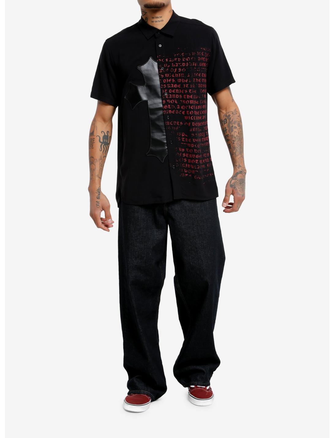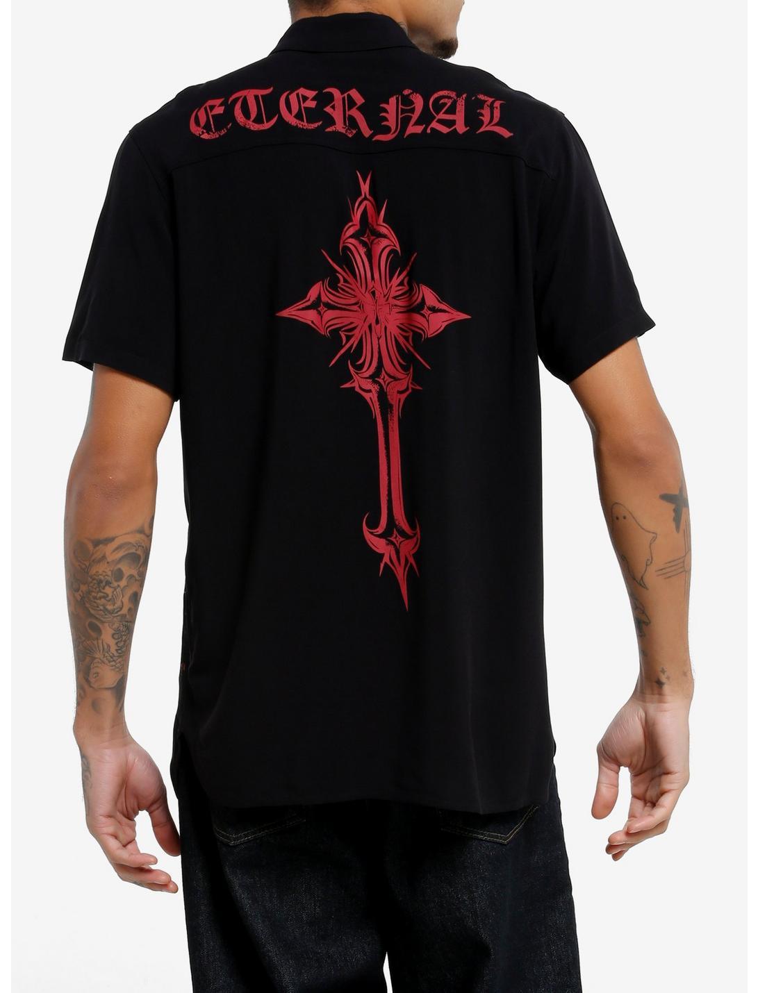 This black split woven button-up has an appliquéd faux leather gothic cross on one side and red stamped text on the other. The back shows an ornate, red gothic cross and the word "Eternal" above.100% rayon challisWash cold; dry lowImportedListed in men's/unisex sizesModel is 6'1"Model wears size Medium