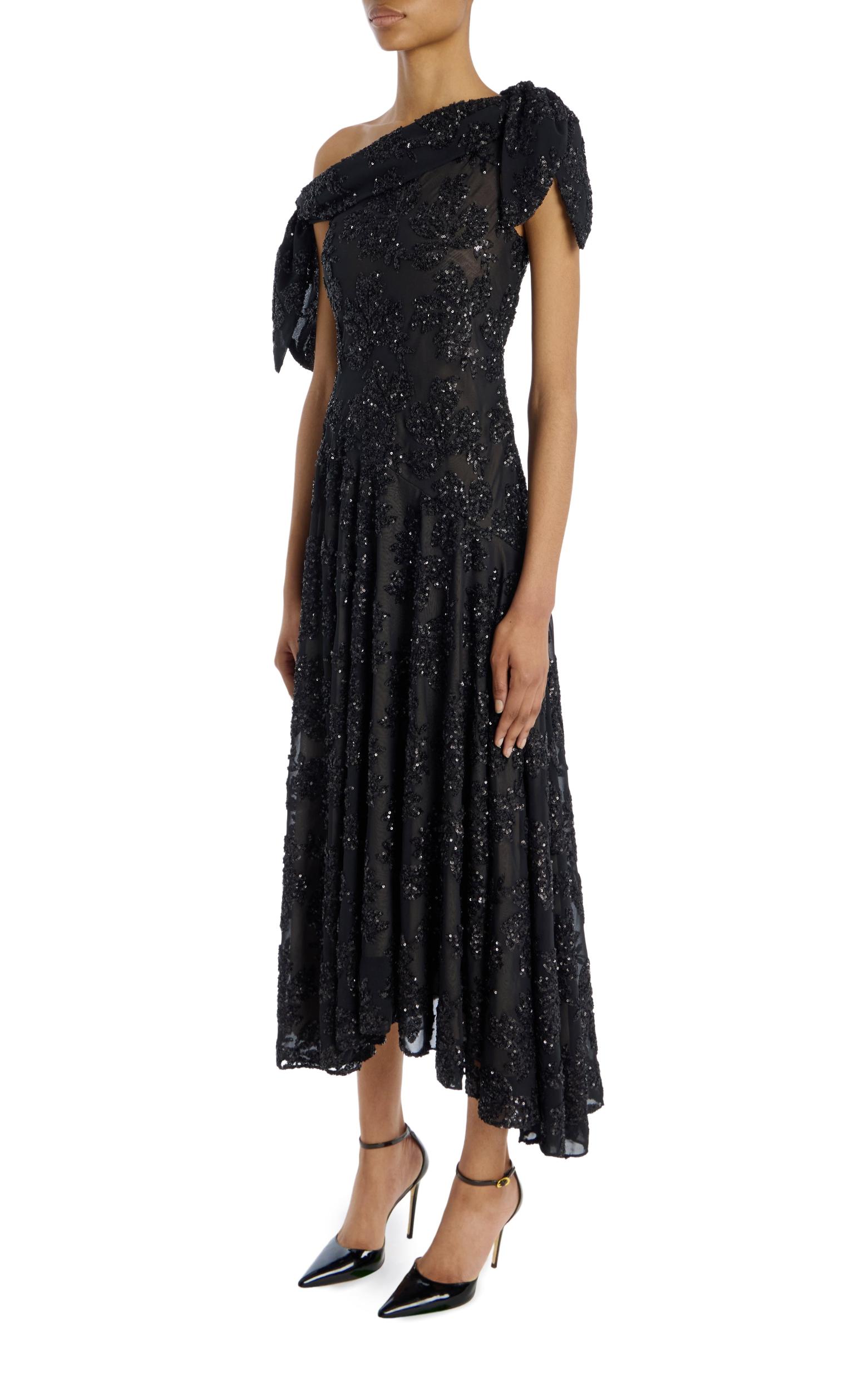 Cut on the bias from a black floral sequin and thread embroidered chiffon, this dress offers an unexpected silhouette with beautiful shimmering detail and an asymmetric hemline. The draped off the shoulder bodice features ties that beautifully frame the shoudlers.