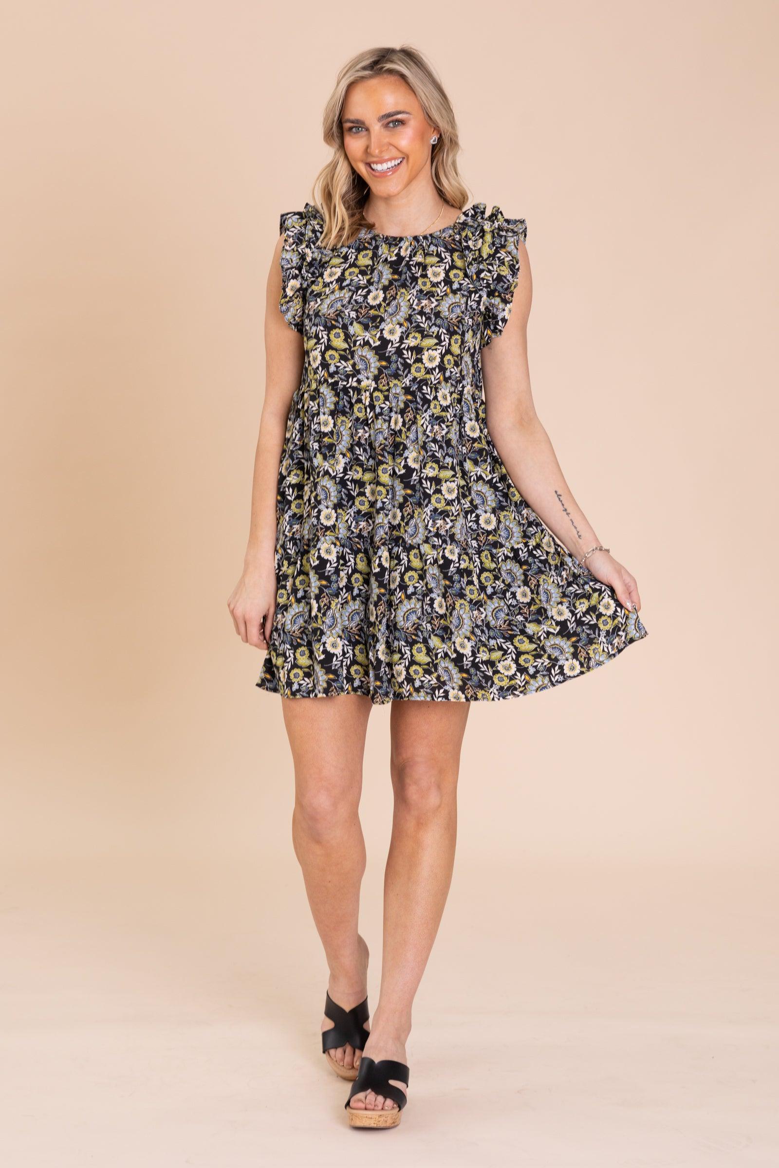 Product Details Colors: Black, Olive, Dusty Blue, Mocha, White, Marigold Print: Floral Neckline: Round Sleeve: Short Sleeve Hemline: Straight Brand: Mittoshop Material and Care 100% Polyester Hand Wash Cold Hang/Line Dry Size and Fit Small: Bust 32" Waist 32" Length 34.5" Medium: Bust 34" Waist 34" Length 35" Large: Bust 36" Waist 36" Length 35.5" Photo model is 5'8 and wearing her true size small