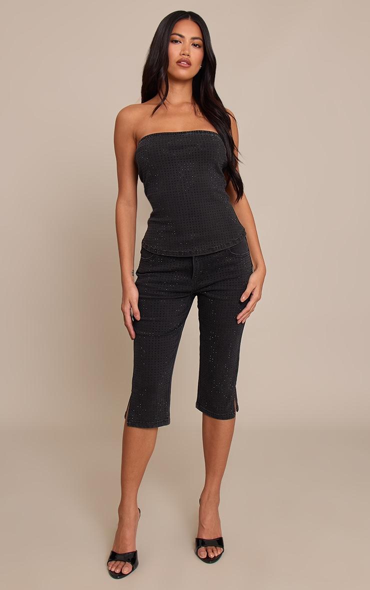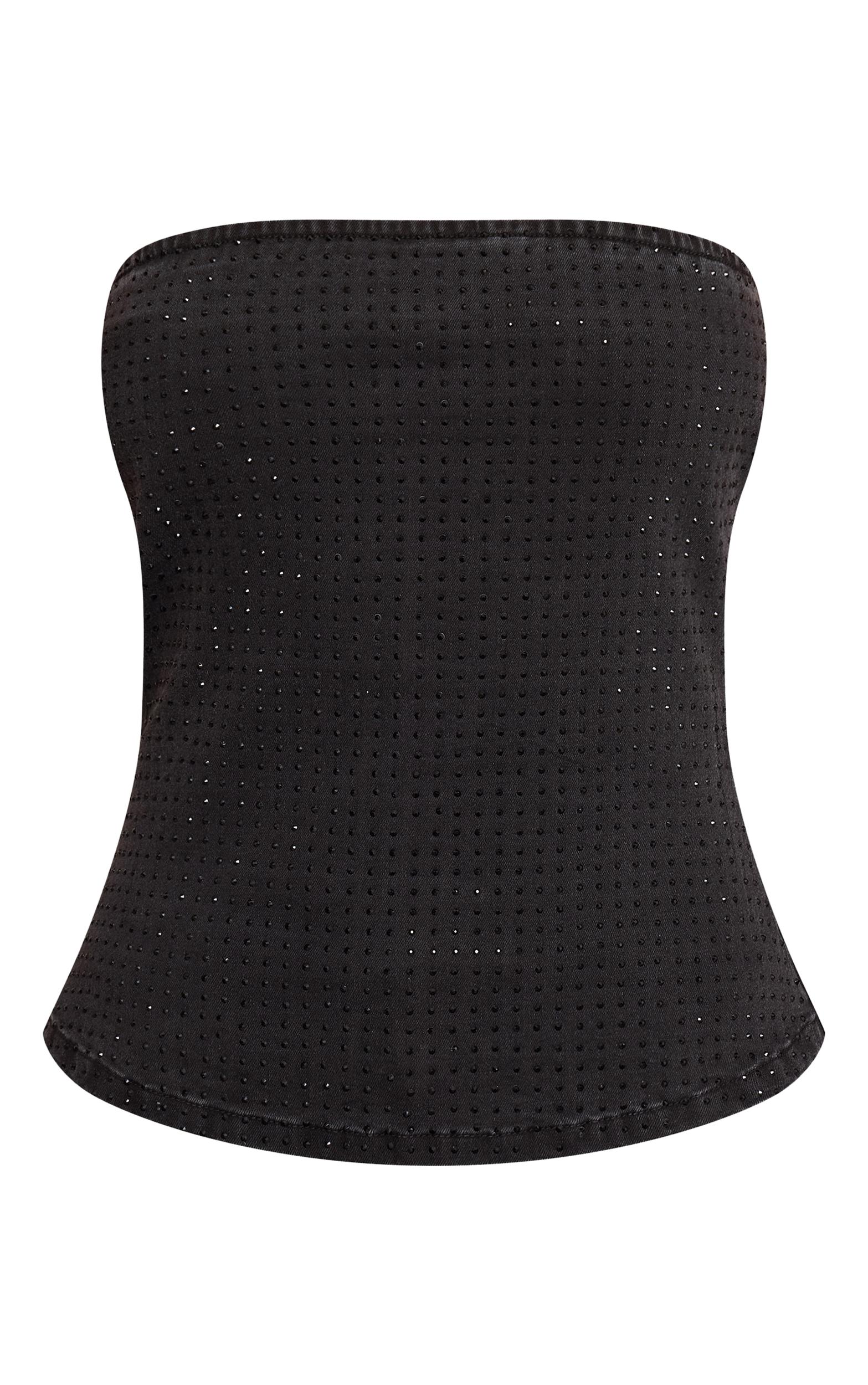 Set the standard for evening wear with the black hotfix diamante seam detail denim top. Brought to you in a black denim material, it boasts a sleek strapless silhouette adorned with delicate hotfix diamante embellishments and defined seam detailing. This confident piece is destined for captivating nights out or an exclusive gathering. Complete your empowered aesthetic with the matching capri's, sharp black kitten heels, and a sleek black bag.Length approx 34.5cm/13.5inch (Based on sample size US 4)Model wears size UK 8/ EU 36/ AUS 8/ US 4Model Height - 5ft 6inchp]:!mb-4inch>Brand: PrettyLittleThingCategory: DenimProduct type: Denim CorsetColor: BlackMaterial: Stretch DenimOccasion: Evening