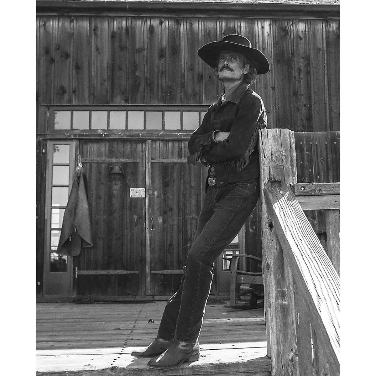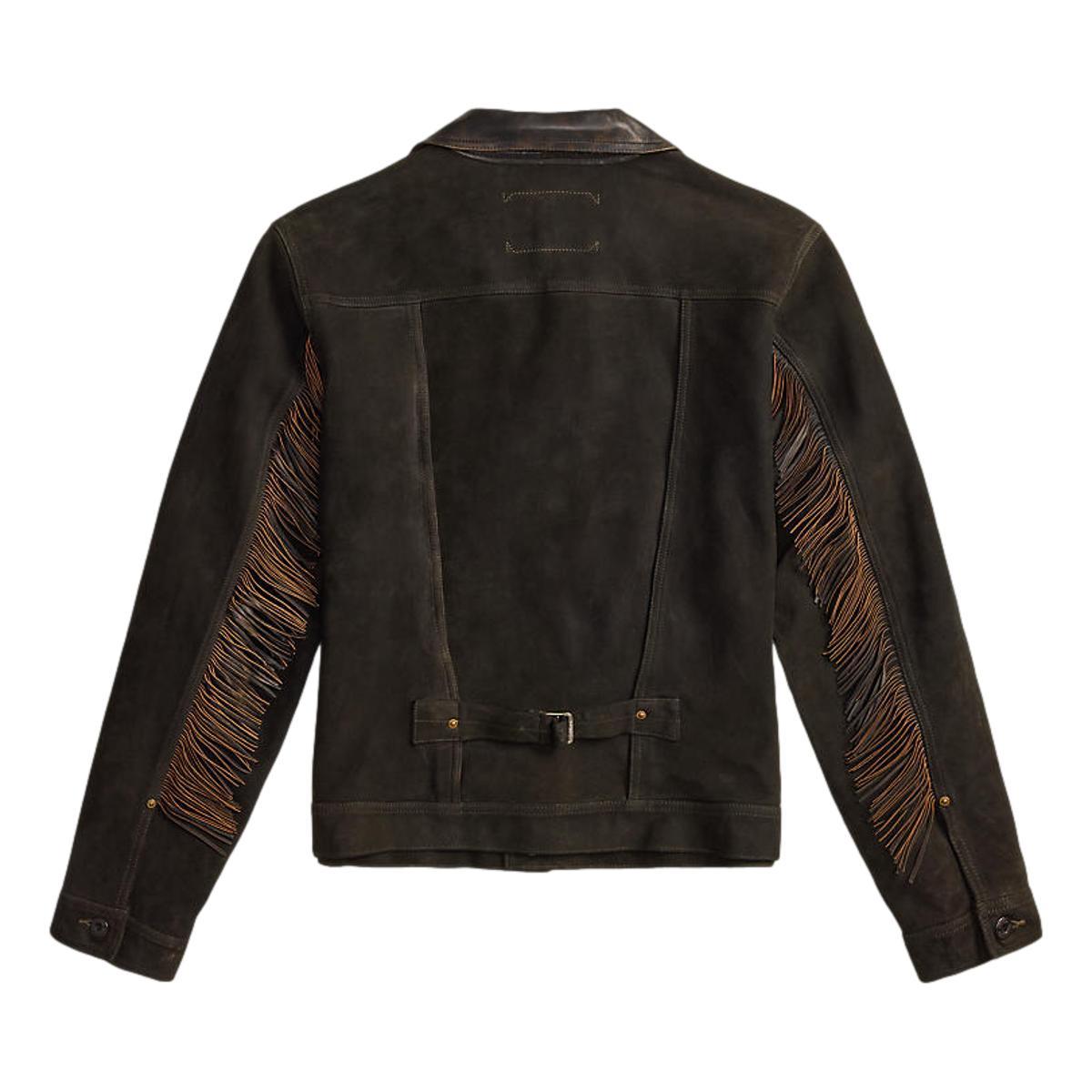 Made from roughout suede. Adjustable buckled tabs at the sides. American-made metal buttons. Lined at the yokes, the sleeves, and the waistband. Size medium has a 25" front body length, a 23.5" back body length, an 18.5" shoulder, a 43" chest, and a 34.75" sleeve length. Sleeve length is taken from the center back of the neck and changes 1" between sizes. Point collar. Buttoned placket. American-made metal buttons. Long sleeves with buttoned barrel cuffs. Left chest buttoned pocket. Two front waist buttoned pockets. Adjustable buckled tabs at the sides. Lined at the yokes, sleeves, and waistband. Shell: suede. Lining: cupro. Dry clean by a leather specialist. Imported.