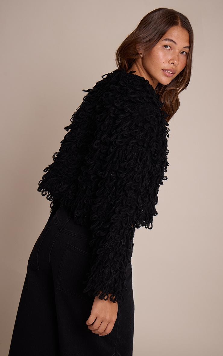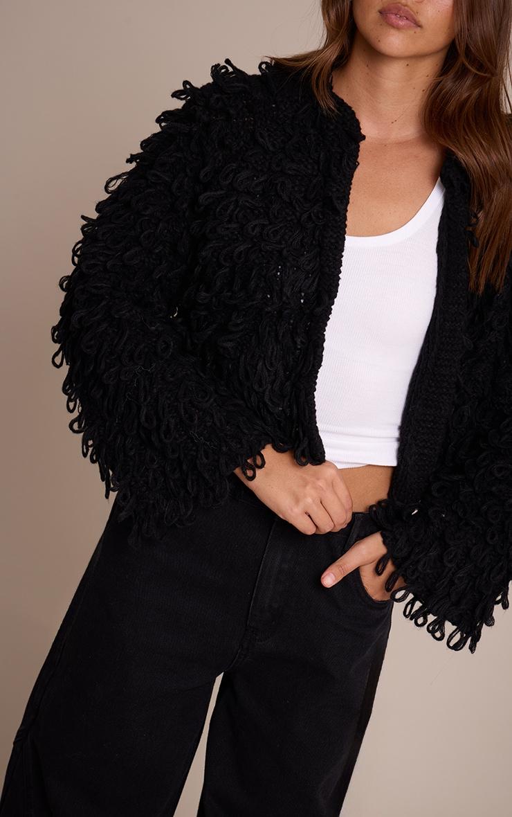 A fresh take on knitwear, this piece champions tactile detail for an assured aesthetic. The black loop knit oversized cardigan presents a compelling cropped silhouette, defined by its artful, voluminous sleeves and an understated collarless neckline, fastening discreetly at the front with neat loop closures. Its generous fit ensures effortless layering, perfect for grounding your everyday ensembles. Style this standout with tailored wide-leg pants and sleek ankle boots for a knowing day look, finishing the ensemble with a structured black bag to carry you through any agenda with understated confidence.Length approx 48.5cm/19inch (Based on sample size S)Model wears size SModel Height - 5ft 9inchp]:!mb-4inch>Category: KnitwearProduct type: CardigansColor: BlackMaterial: KnitOccasion: Day