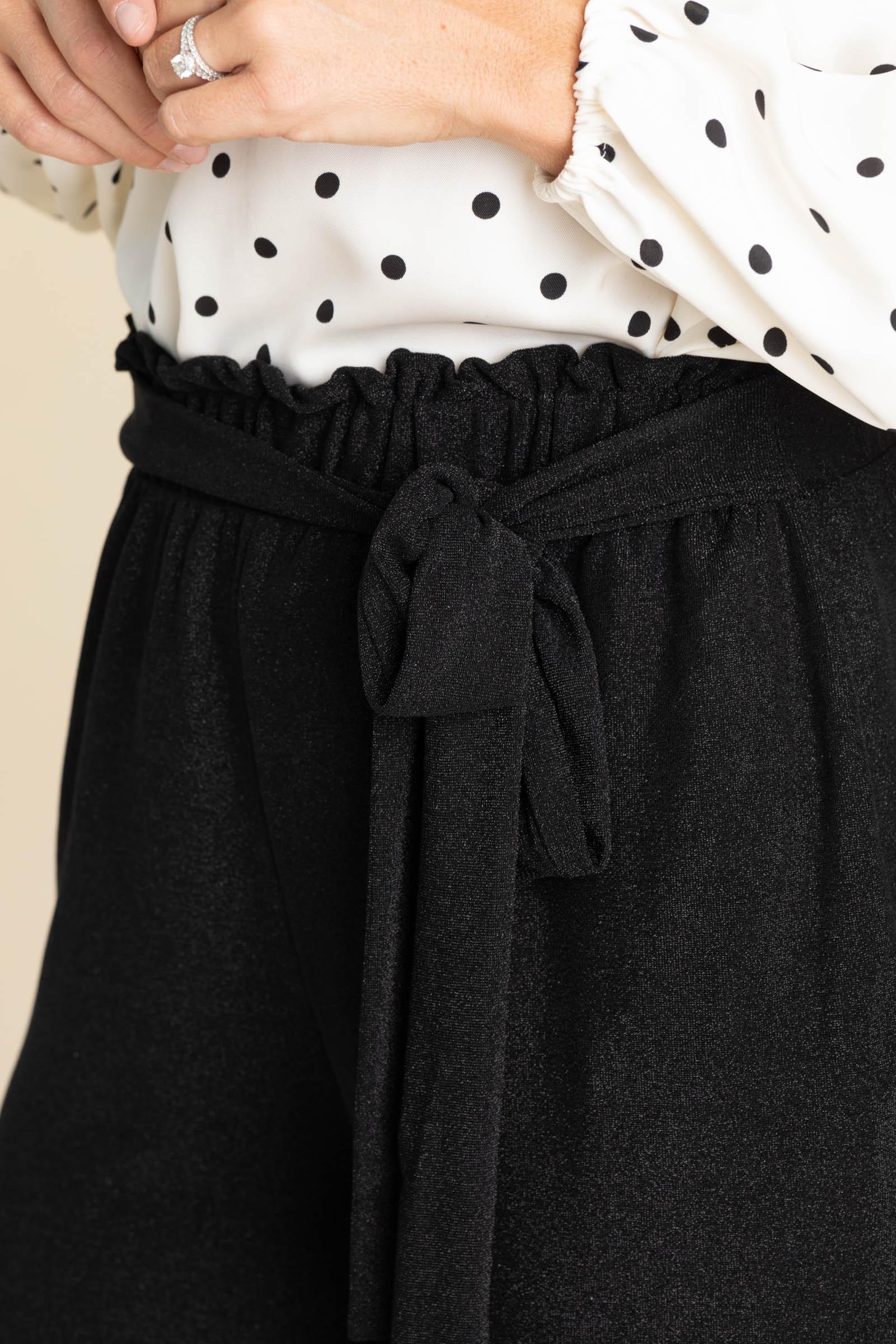 Product Details Colors: Black Print: Metallic Style: Pants with Elastic Waist and Tie Brand: Heimish Material and Care 95% Polyester 5% Spandex Hand Wash Cold Hang/Line Dry Size and Fit Small: Waist 26" Rise 13" Inseam 30" Medium: Waist 28" Rise 13" Inseam 30.5" Large: Waist 30" Rise 13.5" Inseam 31" Erica is 5’7” and wearing her true size medium