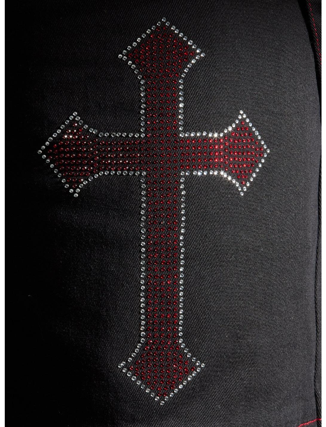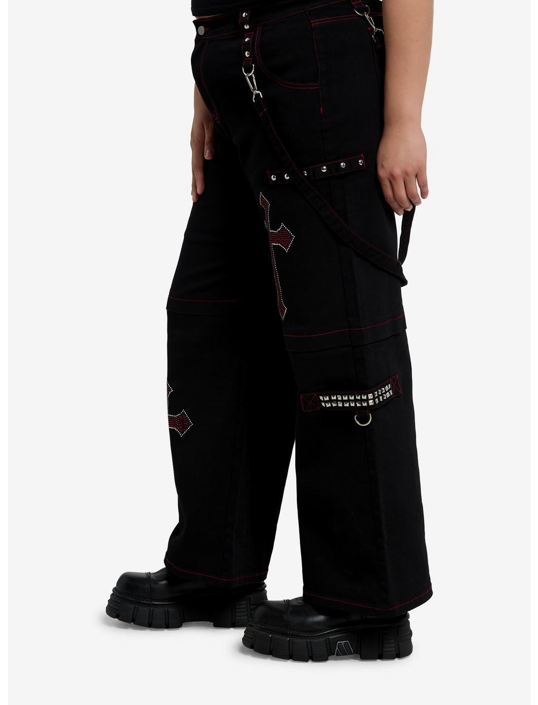 Cross the line into edgy territory with these statement pants! Featuring red rhinestone cross designs down the legs, plus strap detailing with stud accents. They have a wide leg fit and come with pockets and removable suspender straps.97% cotton; 3% spandexWash cold; dry lowRise: 14''Inseam: 31''ImportedModel is 5'10''