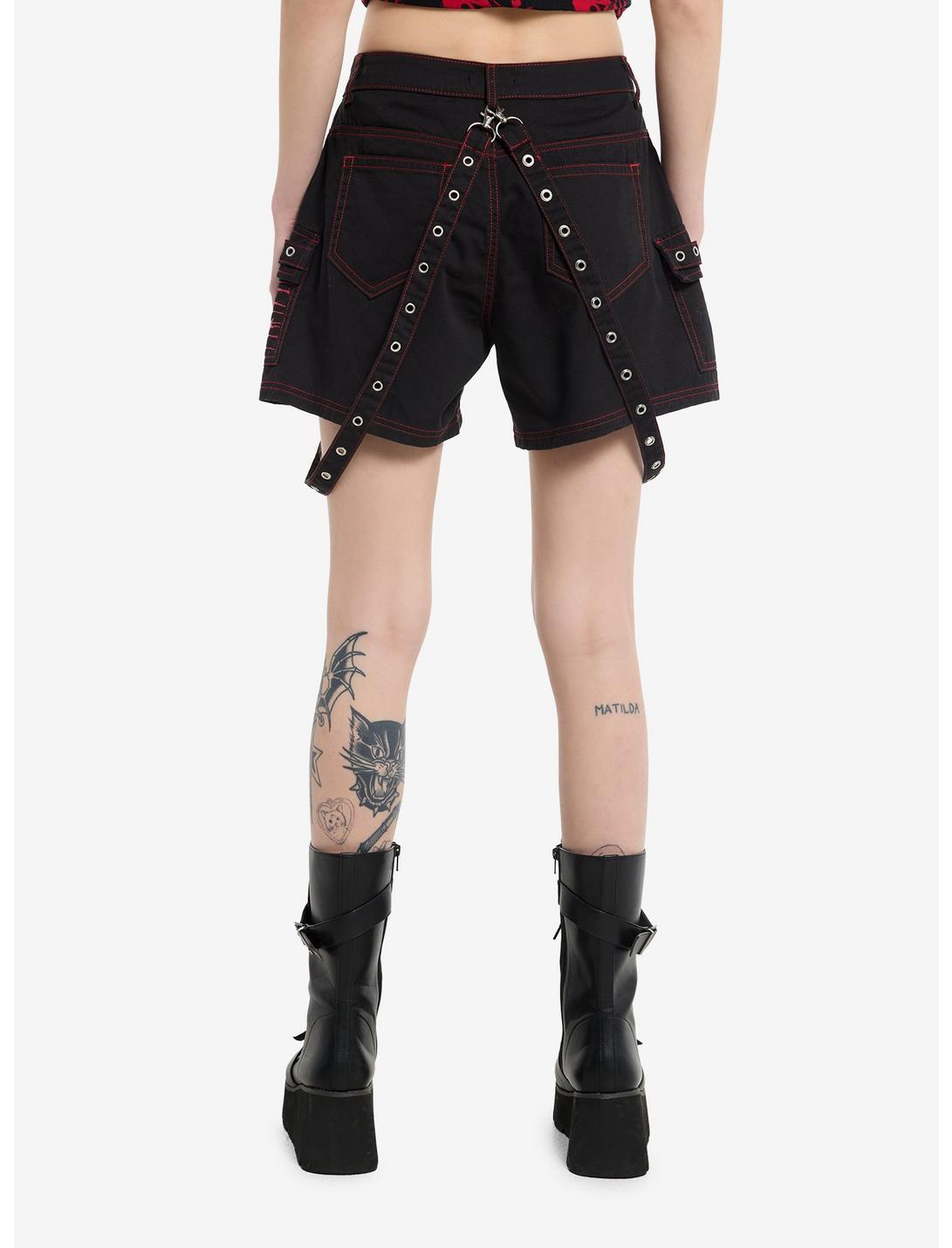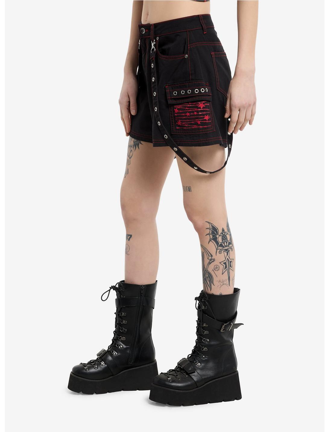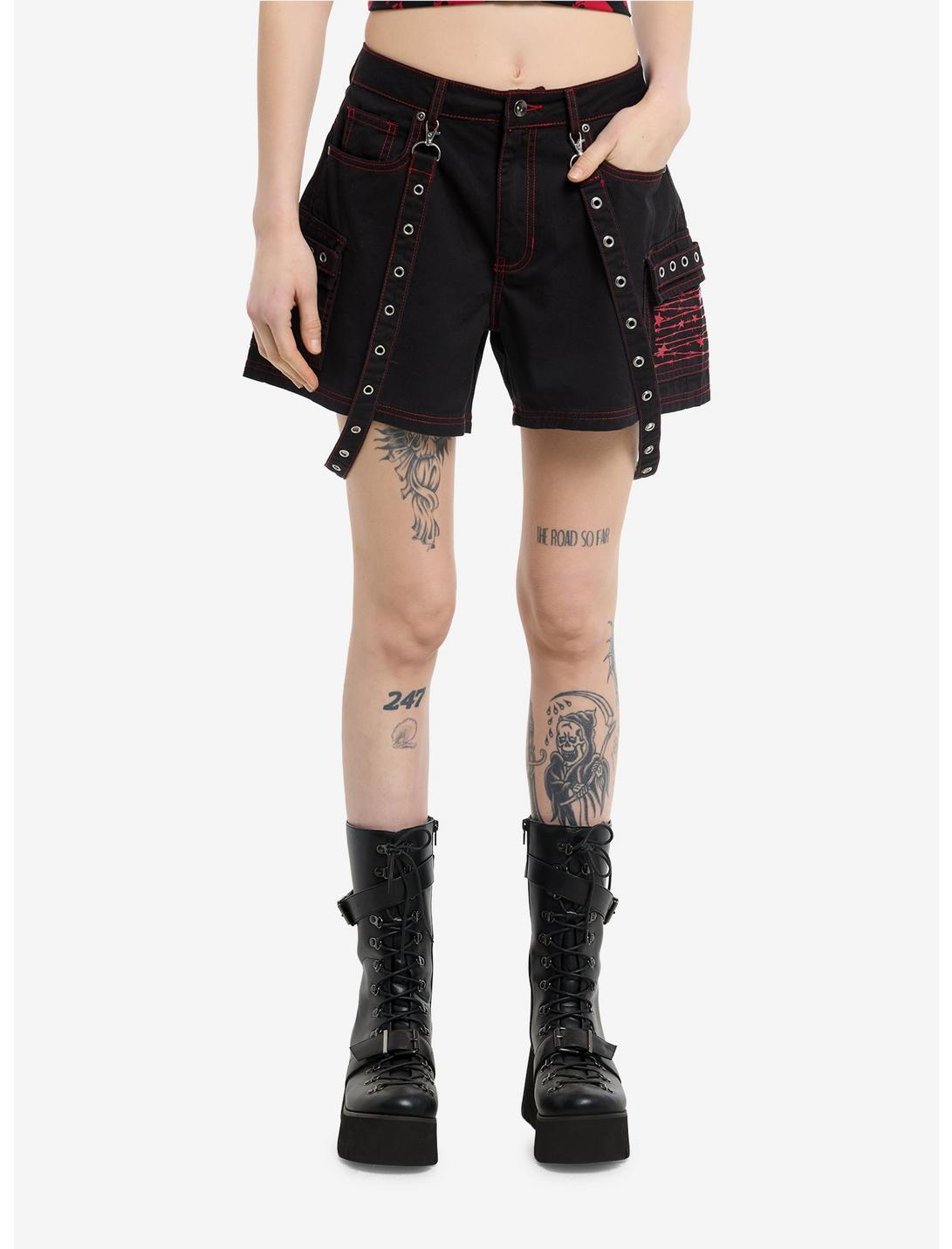 These black and red contrast stitch shorts have cargo pockets decorated with grommets and red graphics of barbed wire and stars on one side and a skull and crossbones on the other side. The shorts have removable grommet suspenders.100% cottonWash cold; dry lowRise: 11"Inseam: 4"ImportedListed in junior sizesModel is 5'10"Model wears size 3