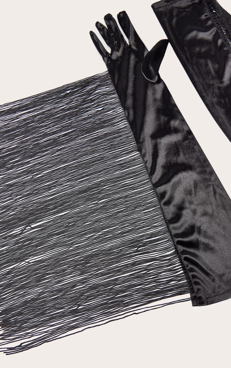 Opt for statement detailing with the black satin fringe detail long gloves. Crafted from black satin with playful fringe accents, these gloves are a bold finishing touch. Pair with a fitted jumpsuit and heels for a fashion-forward ensemble.p]:!mb-4inch>Brand: PrettyLittleThingCategory: AccessoriesProduct type: GlovesColor: BlackMaterial: SatinOccasion: Halloween
