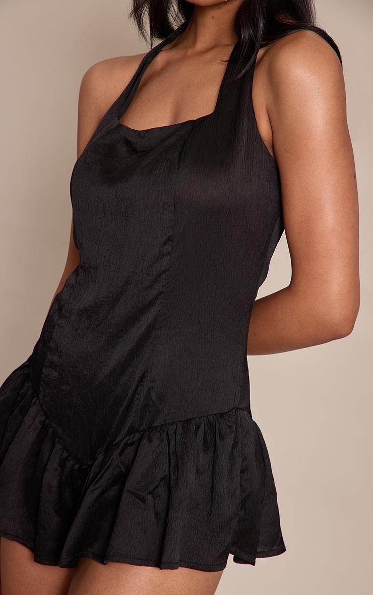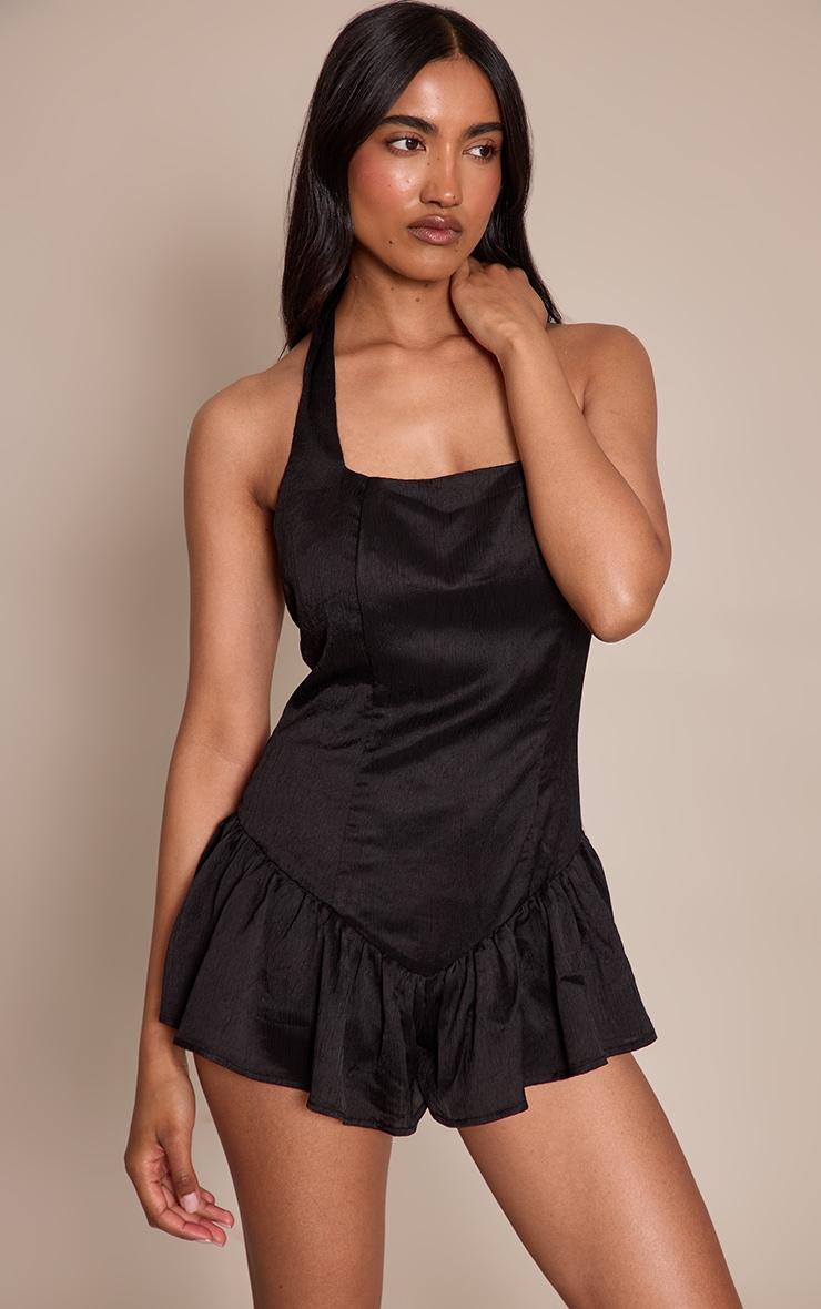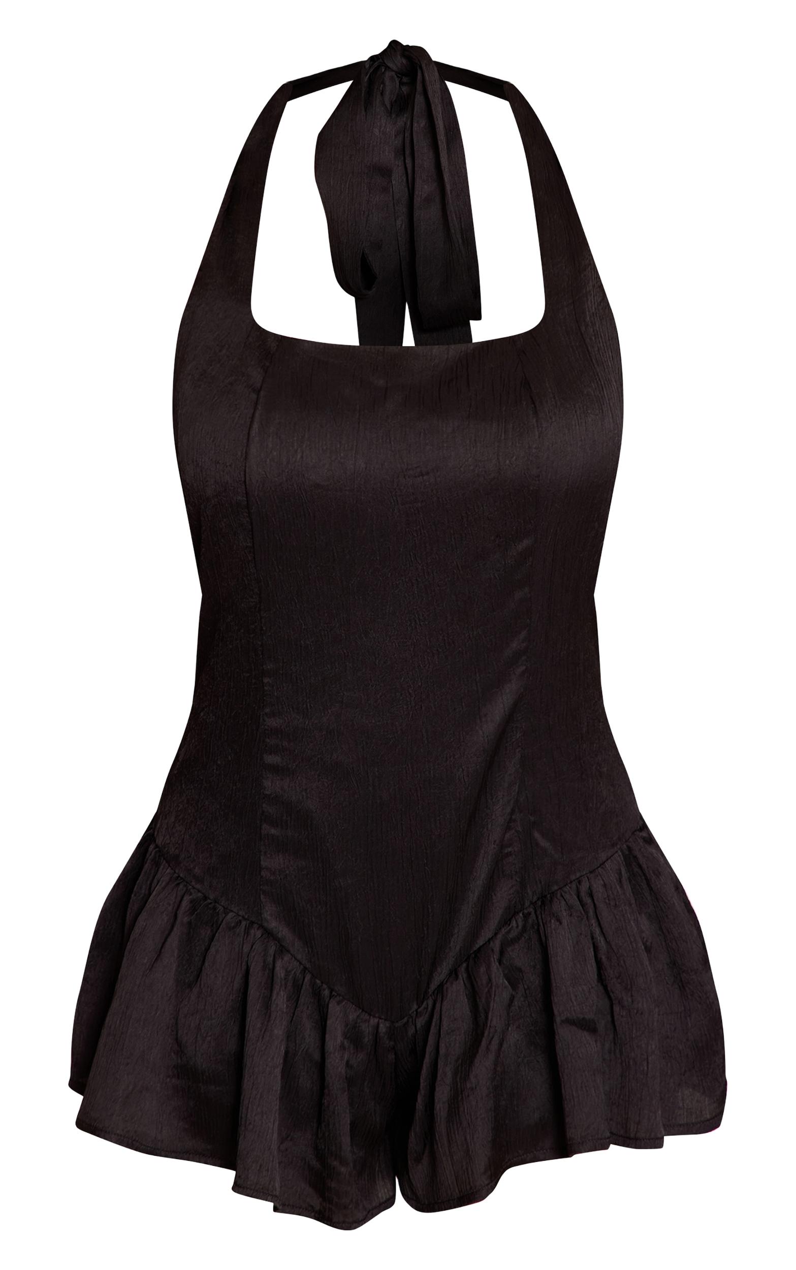 Command attention effortlessly. The black satin halterneck frill floaty romper delivers a knowing edge, distinguished by its crisp square neckline, slender halter straps, and a distinctive frill hem that adds an unexpected dimension. Perfect for evening plans, complete this look with striking brown heels and a touch of delicate gold jewelry for an aesthetic that’s as confident as it is captivating.Length approx 81.5cm/32inch (Based on sample size US 4)Model wears size UK 8/ EU 36/ AUS 8/ US 4Model Height - 5ft 9inchp]:!mb-4inch>Brand: PrettyLittleThingCategory: DressesProduct type: Floaty PlaysuitColor: BlackMaterial: SatinOccasion: Evening