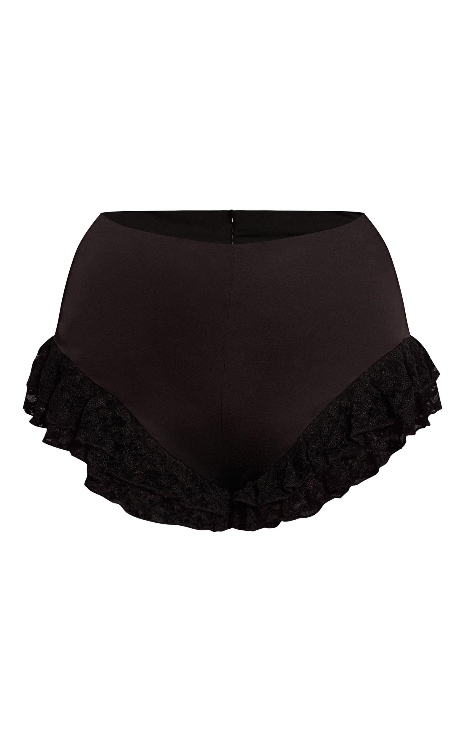 Unveil your after-dark presence with the undeniable impact of these black satin lace ruffle hot pants. This distinctive silhouette commands attention, featuring a confident high-waisted cut that leads to intricate lace and ruffle detailing along the hem, creating an artful, dimensional finish. Pair these hot pants with a sleek, unbuttoned blouse or a sharp tailored blazer for an assured evening ensemble. Ground your confident look with statement black thigh high boots and complete your aesthetic with a stack of gold bracelets, curating an effortlessly polished presence that truly owns the night.Length approx 33cm/13inch (Based on sample size US 4)Model wears size UK 8/ EU 36/ AUS 8/ US 4Model Height - 5ft 10inchp]:!mb-4inch>Brand: PrettyLittleThingCategory: BottomsProduct type: Hot PantColor: BlackMaterial: SatinOccasion: Evening