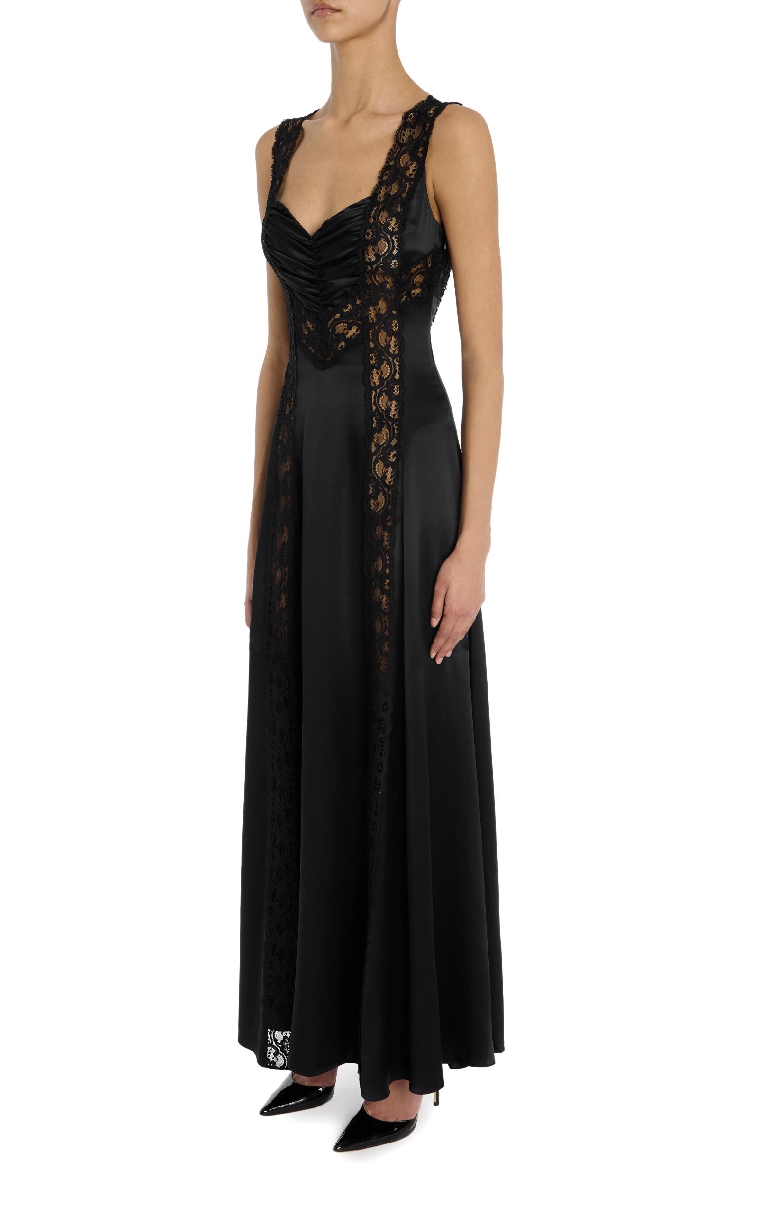 Black silk charmeuse imparts a sophisticated sheen to this ankle-skimming bias slip dress. Draped silk ruches at the bustline, outlined with black lace panels that run vertically along the dress and are secured by a distinctive V-line at the waist.