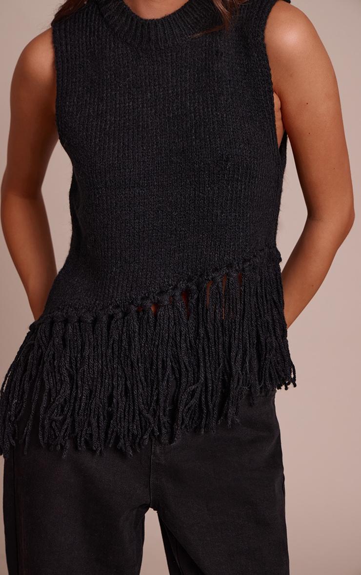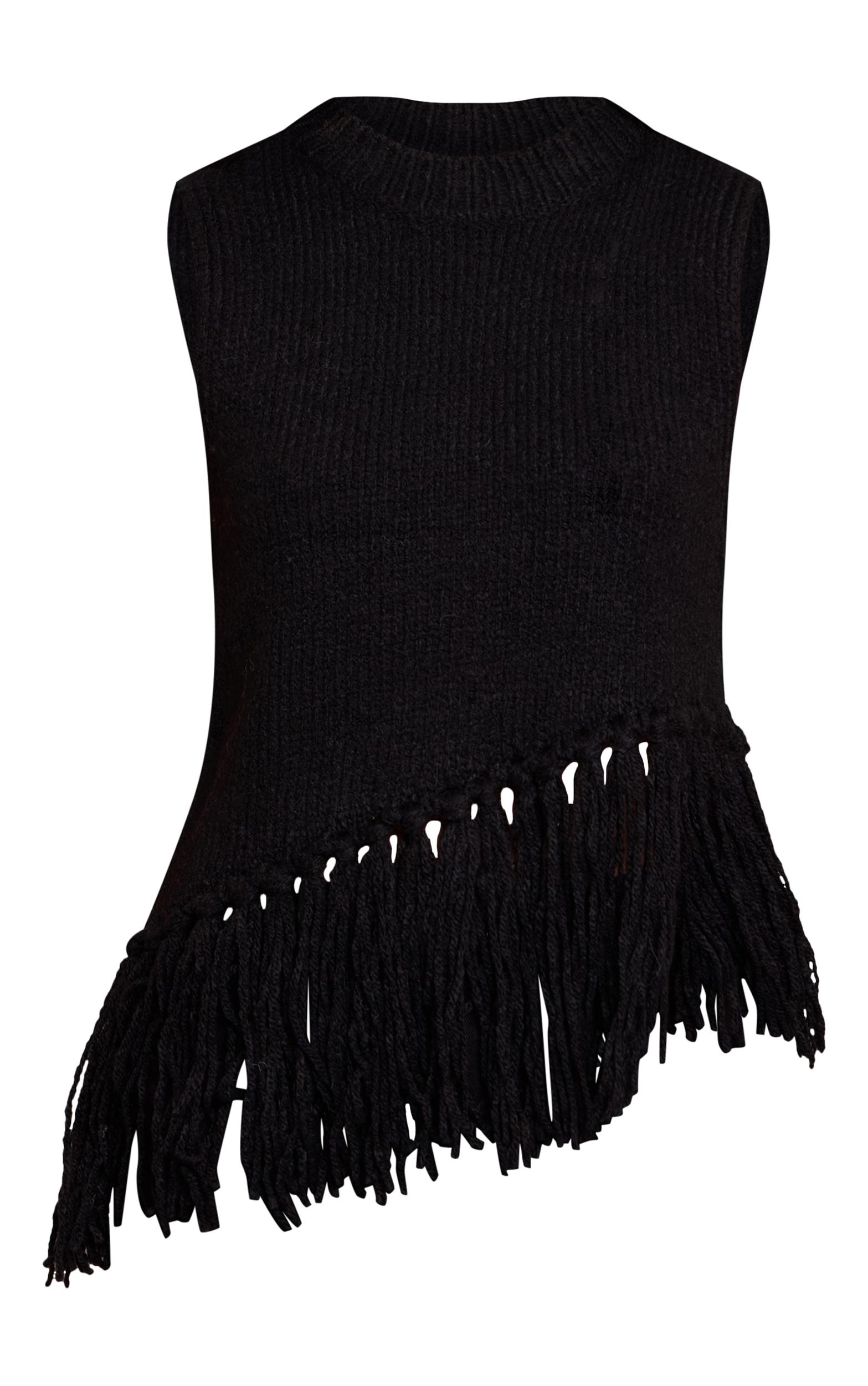 The classic knit takes a bold turn with a distinct, artful edge. This black sleeveless fringe detail sweater makes a confident statement, featuring a high crew neckline and an eye-catching diagonal fringe detail that cascades across the hem, creating a dynamic silhouette. Layer this knowing piece over a crisp white shirt or wear it solo with sleek tailored pants, allowing its unique embellishment to truly shine. Finish your look with confident cowboy boots and a pair of delicate gold earrings for an effortlessly composed aesthetic that transitions seamlessly through your day.Length approx 48.5cm/19inch (Based on sample size US 4)Model wears size UK 8/ EU 36/ AUS 8/ US 4Model Height - 5ft 7inchp]:!mb-4inch>Category: KnitwearProduct type: SweaterColor: BlackMaterial: KnitOccasion: Day