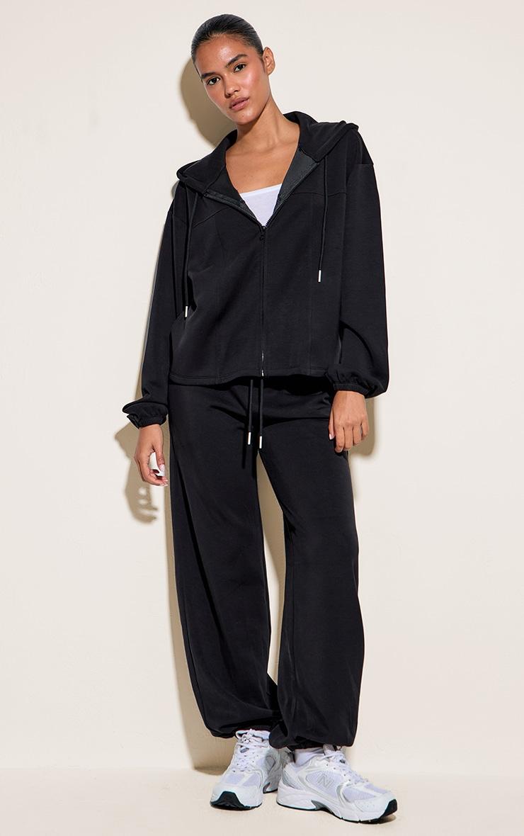 Wrap up in the black super soft zip hoodie. Made from a black ultra-soft fabric with a zip front and relaxed fit, it’s perfect for layering over your activewear or loungewear looks. Team with matching sweatpants or leggings for everyday ease.Length approx 66cm/26inch (Based on sample size S)Model wears size SModel Height - 5ft 7inchp]:!mb-4inch>Category: AthleisureProduct type: HoodieColor: BlackMaterial: Slinky JerseyDesign: PlainOccasion: Day