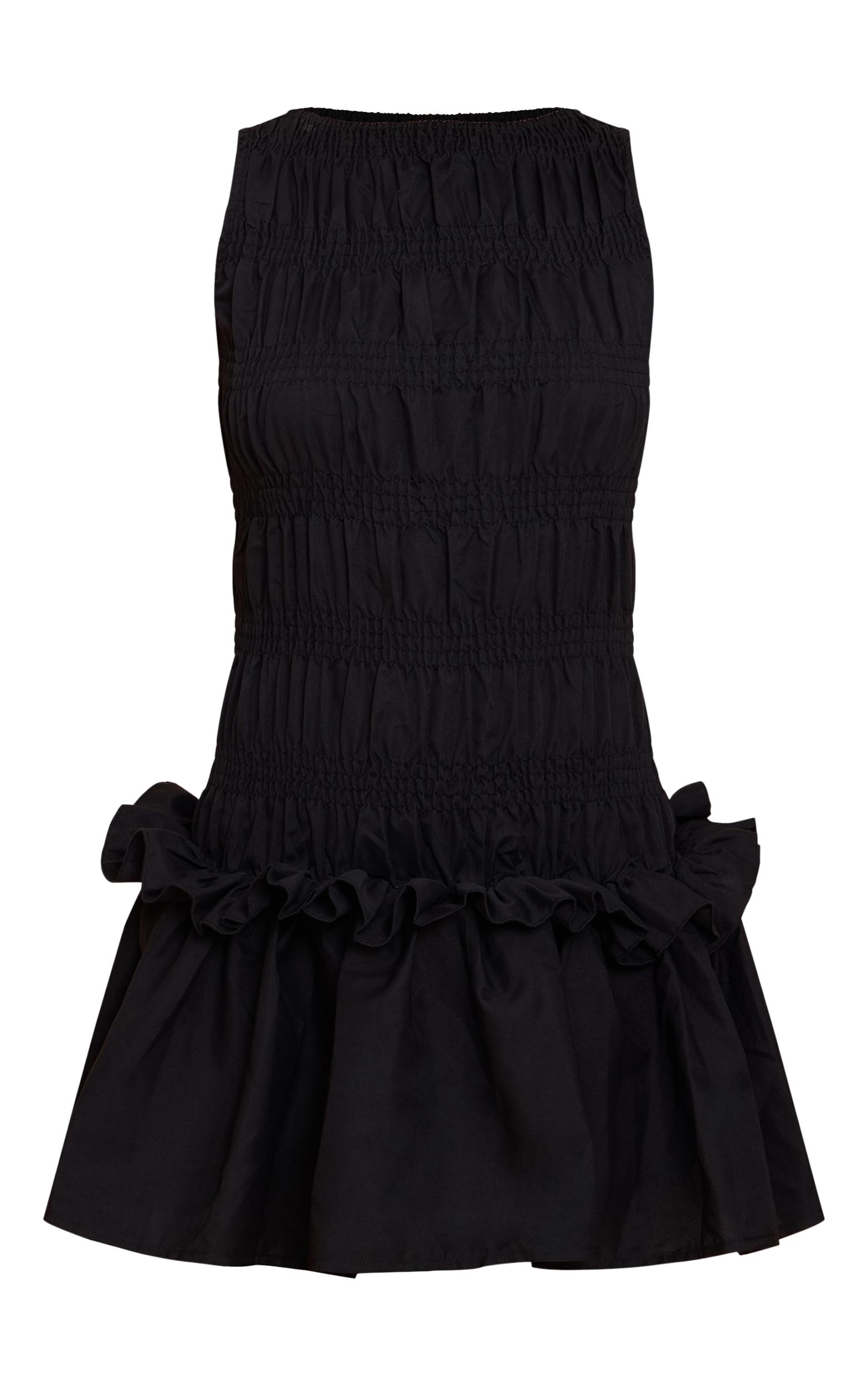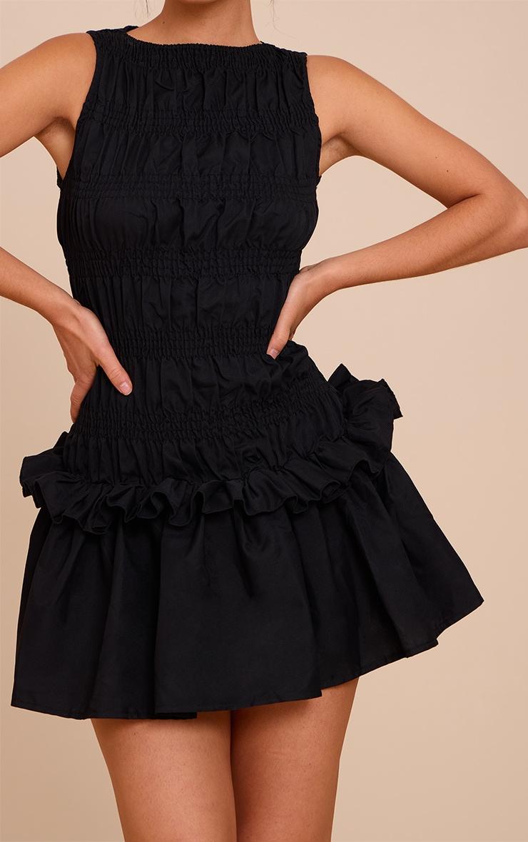 Effortless style just got its new hero: the black tailored shirred frill shift dress. This day-ready piece boasts a relaxed, sleeveless cut with a clean boat neckline. Its key feature is the intricate shirred bodice, creating subtle texture and shaping, before flowing into a playful dropped waist. A charming frilled tier completes the mini hemline, adding an artful finish. Perfect for sun-drenched days, style it with chunky sneakers and an oversized denim jacket for a confident, off-duty vibe, proving daywear can be anything but basic.Length approx 81.5cm/32inch (Based on sample size US 4)Model wears size UK 8/ EU 36/ AUS 8/ US 4Model Height - 5ft 7inchp]:!mb-4inch>Brand: PrettyLittleThingCategory: DressesProduct type: Shift DressColor: BlackMaterial: Woven CrepeOccasion: Day
