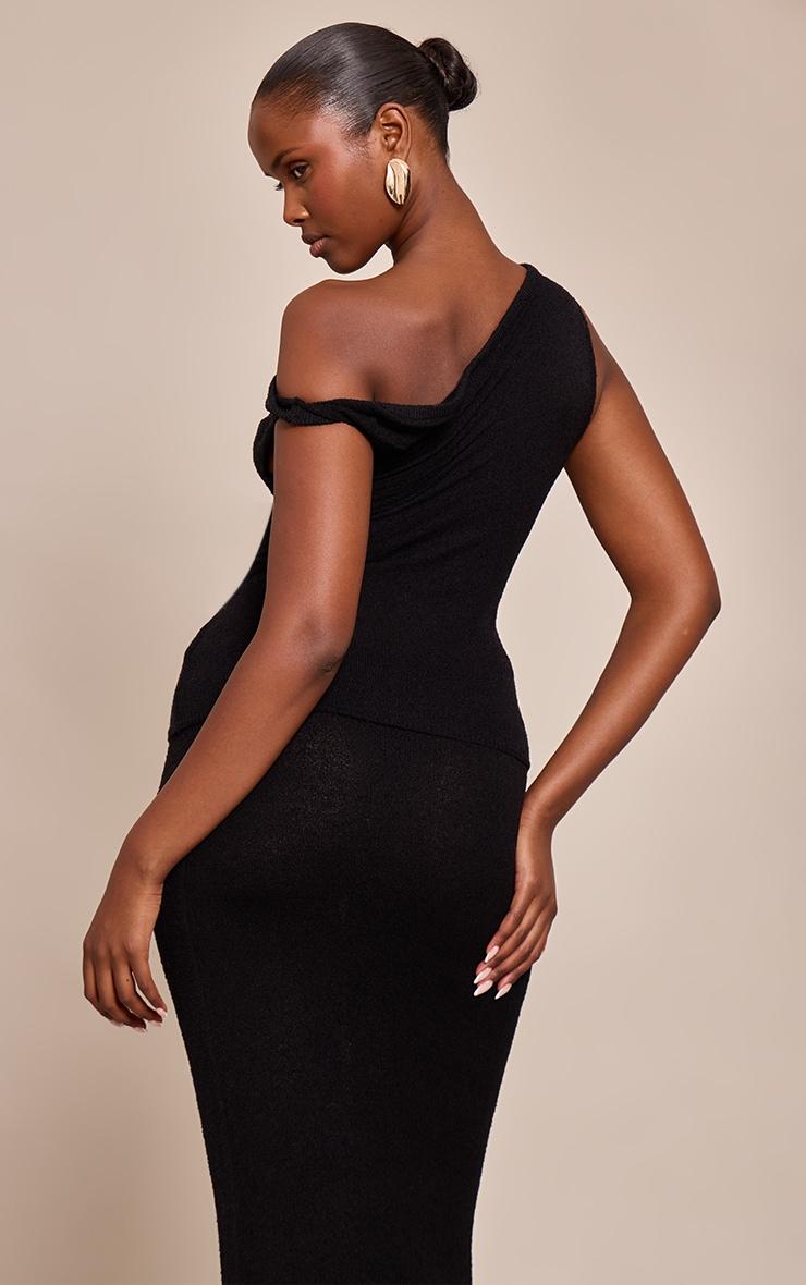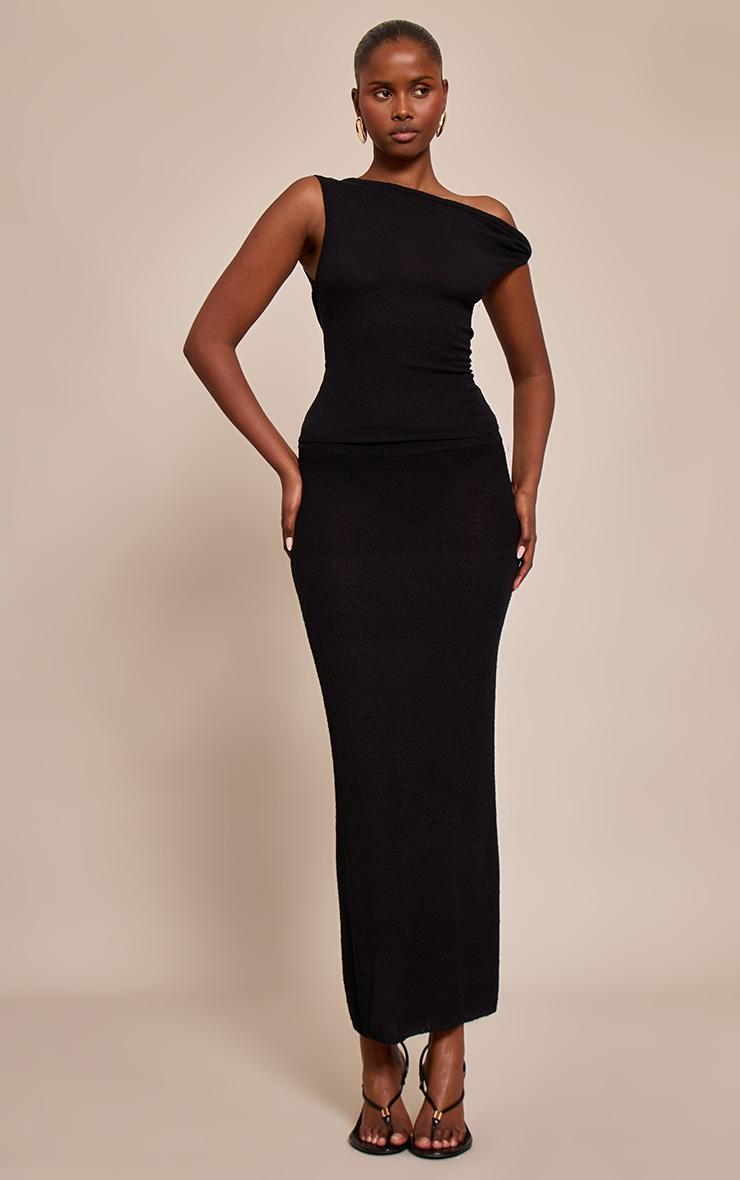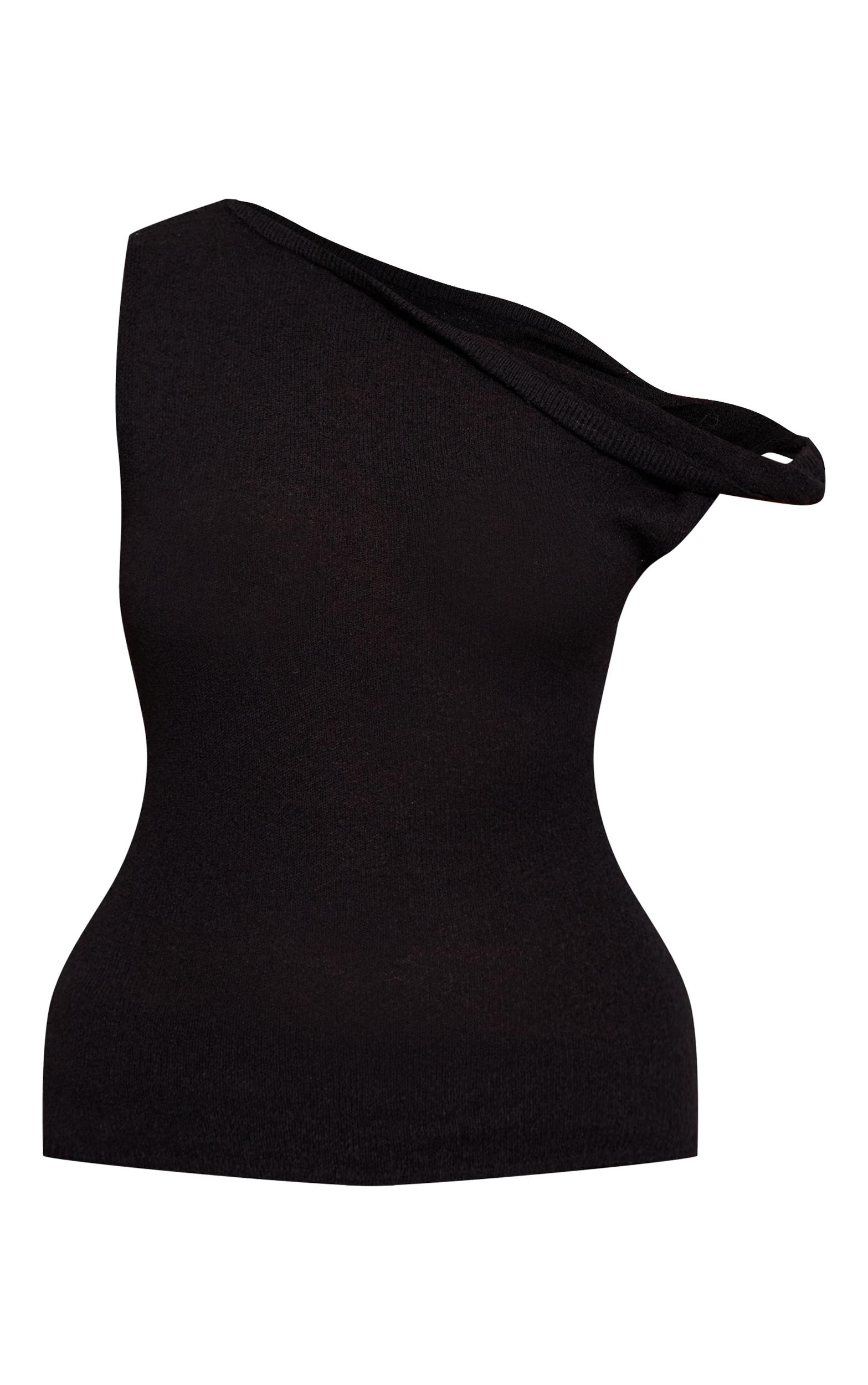The black towelling fine knit asymmetric top brings modern texture and architectural design to casual styling. Made from a fine knit with a soft towelling finish, it features an asymmetric neckline that adds interest and edge. Its fitted silhouette makes it versatile for layering or wearing as a statement piece. Team with the matching maxi skirt for an effortless evening look, or dress it down with high-waisted jeans and loafers.Length approx 48.5cm/19inch (Based on sample size S)Model wears size SModel Height - 5ft 9inchp]:!mb-4inch>Brand: PrettyLittleThingCategory: KnitwearProduct type: Bardot TopColor: BlackMaterial: KnitOccasion: Day