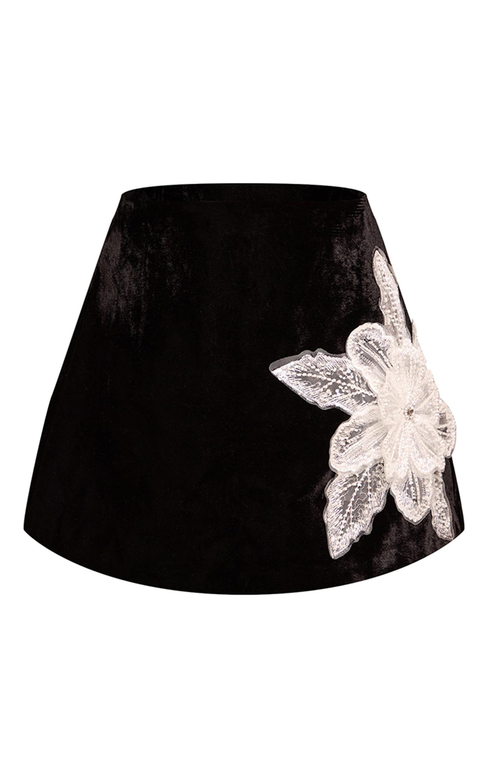 Make an entrance in the black velvet floral applique embellished a-line mini skirt. It showcases an a-line mini cut with intricate floral appliques on black velvet. Ideal for setting the tone at your next special event. Pair with a fitted top, shimmering black heels, and subtle pearl earrings.Length approx 33cm/13inch (Based on sample size US 4)Model wears size UK 8/ EU 36/ AUS 8/ US 4Model Height - 5ft 6inchp]:!mb-4inch>Brand: PrettyLittleThingCategory: BottomsProduct type: Mini SkirtColor: BlackMaterial: VelvetDesign: PlainOccasion: Occasion