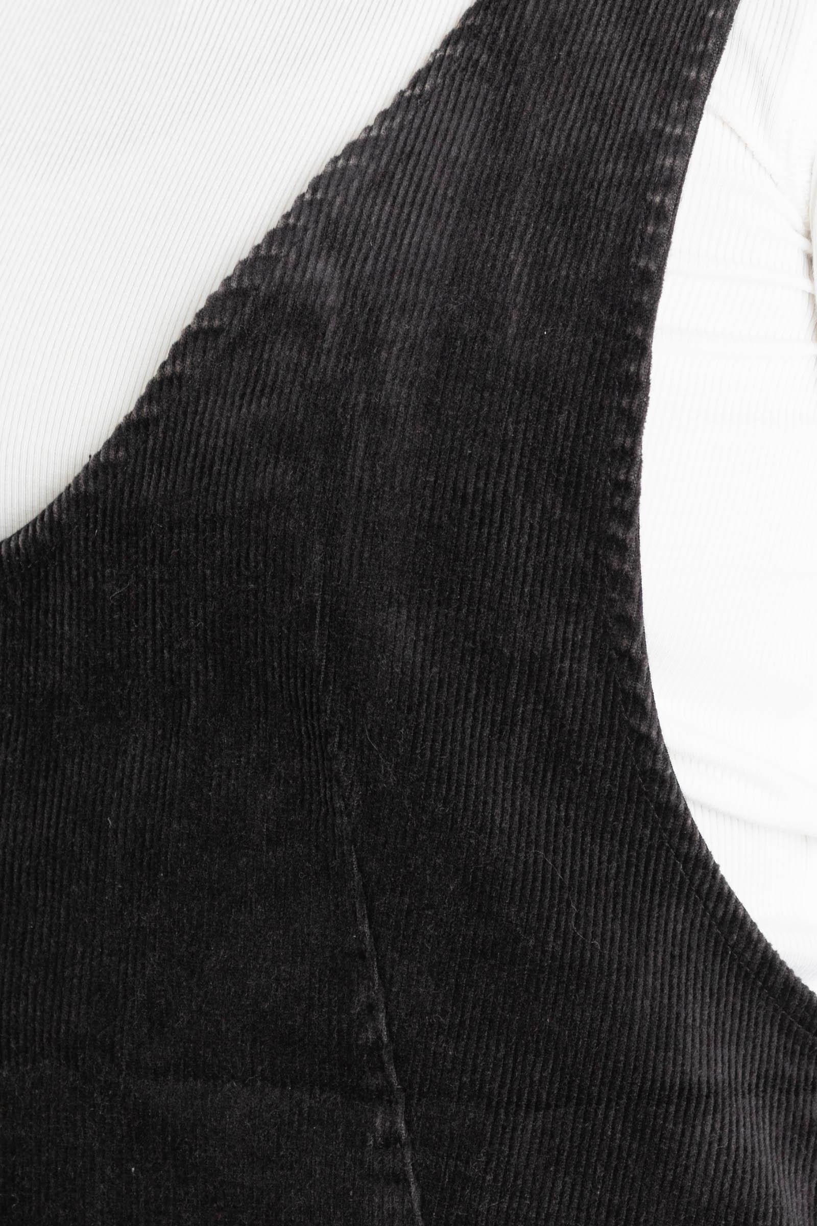 Product Details Colors: Black Print: Corduroy Neckline: V-Neck Sleeve: Sleeveless Hemline: Straight Brand: Hem & Thread Material and Care Self: 100% Cotton Hand Wash Cold Hang/ Line Dry Size and Fit Small: Bust 34 Waist 36" Length 35" Medium: Bust 36" Waist 38" Length 35.5" Large: Bust 38" Waist 40" Length 36" Renae is 5’2 and wearing her true size small