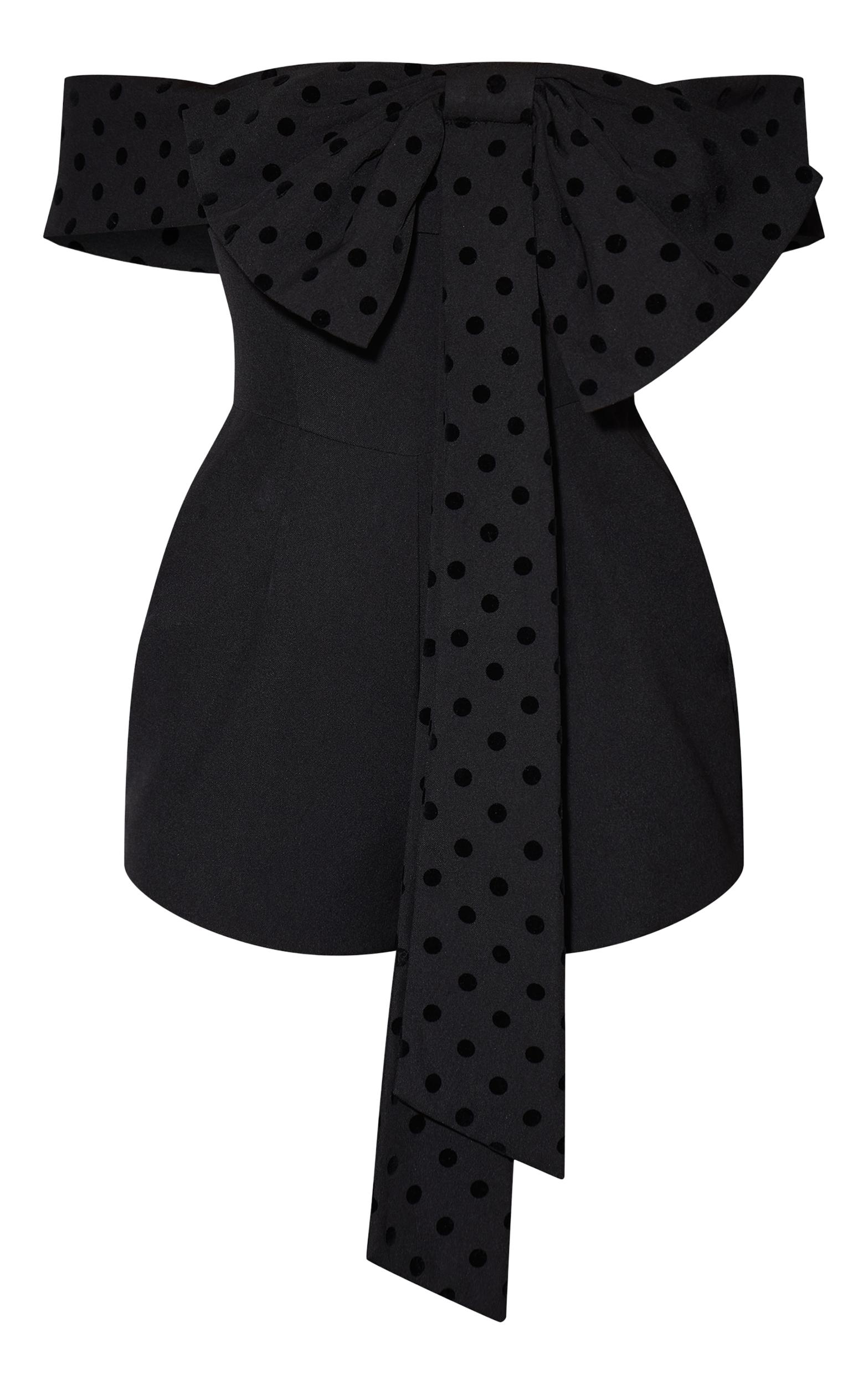 Make a statement with undeniable confidence. The black woven contrast velvet bow romper is a masterclass in occasion dressing, featuring a commanding off-the-shoulder neckline that gracefully frames the décolletage. Its tailored bodice is artfully cinched, leading into neat romper shorts, while a striking velvet bow takes center stage, adorned with subtle polka dots and elegant, flowing ties that add a dynamic flourish. Elevate this impactful ensemble with sleek metallic heels and delicate stud earrings, ensuring an effortlessly polished presence that truly owns the room.Length approx 58.5cm/23inch (Based on sample size US 4)Model wears size UK 8/ EU 36/ AUS 8/ US 4Model Height - 5ft 6inchp]:!mb-4inch>Brand: PrettyLittleThingCategory: DressesProduct type: Floaty PlaysuitColor: BlackMaterial: Tailored WovenOccasion: Occasion