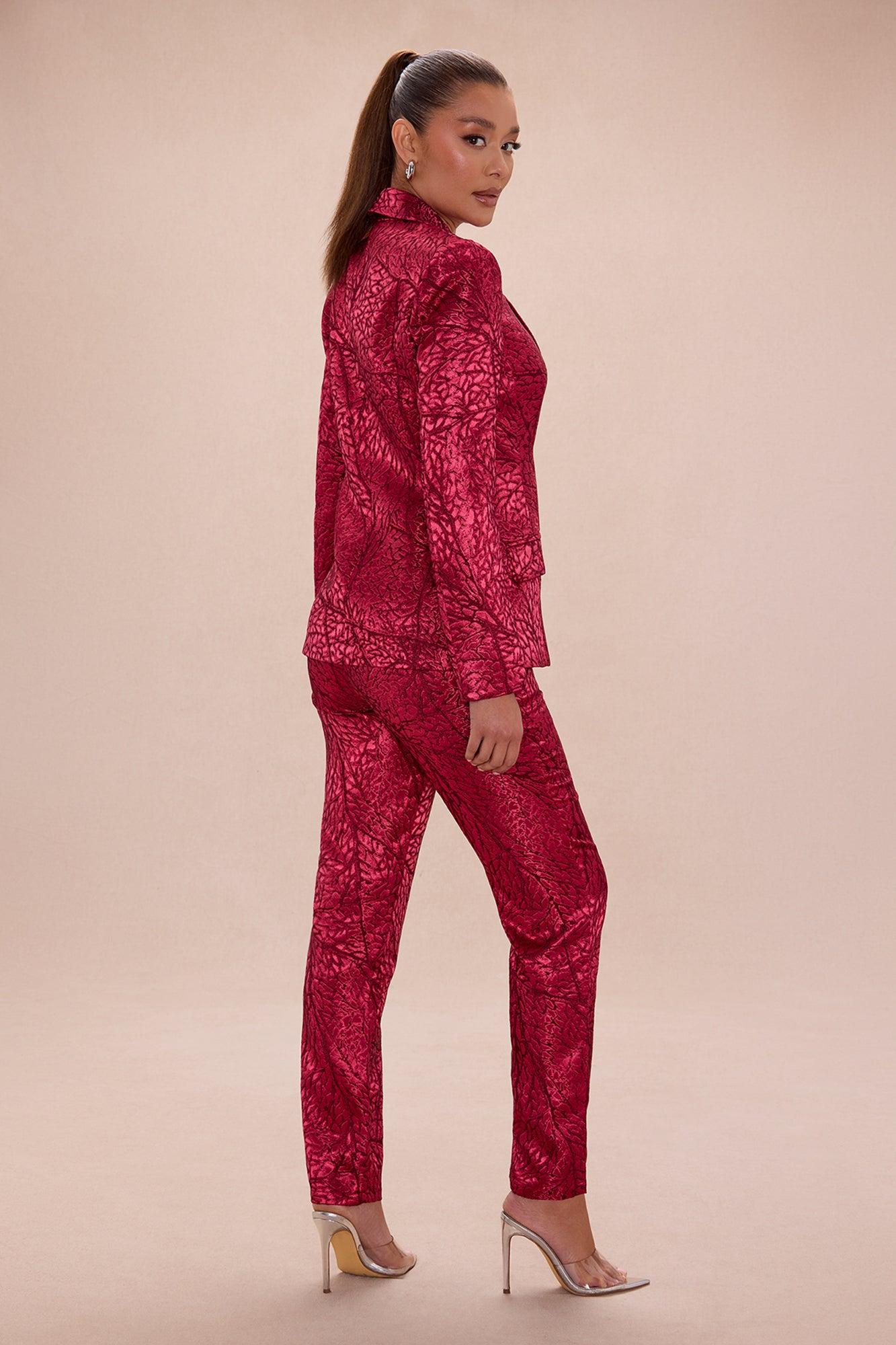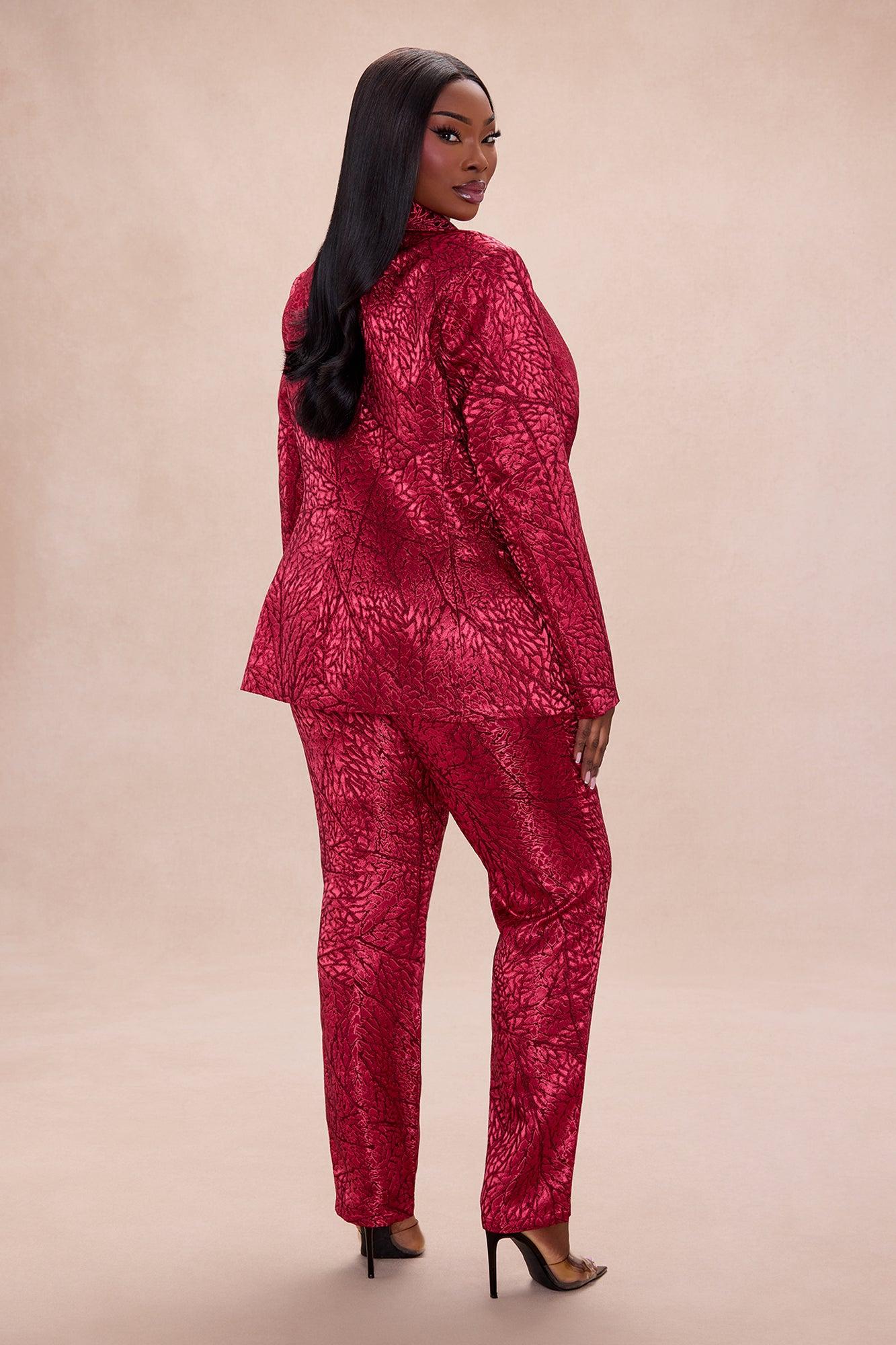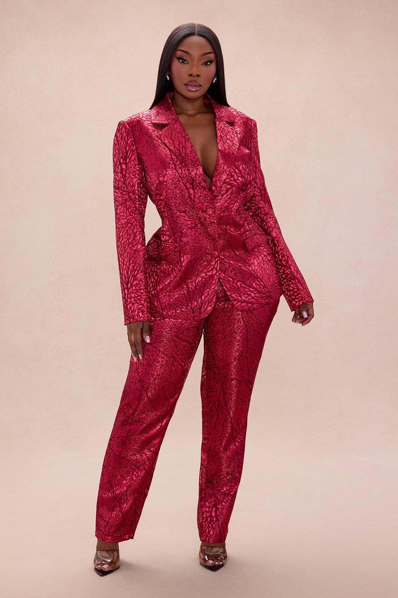 Available In Burgundy/combo. Jacquard Suit Ensemble Long Sleeve Blazer Collared Faux Pockets Front Button Closure Lined Non Stretch Pant Pockets Front Hook And Zipper Closure Non Stretch Shell: 60% Polyester 40% Rayon Lining: 100% Polyester Imported