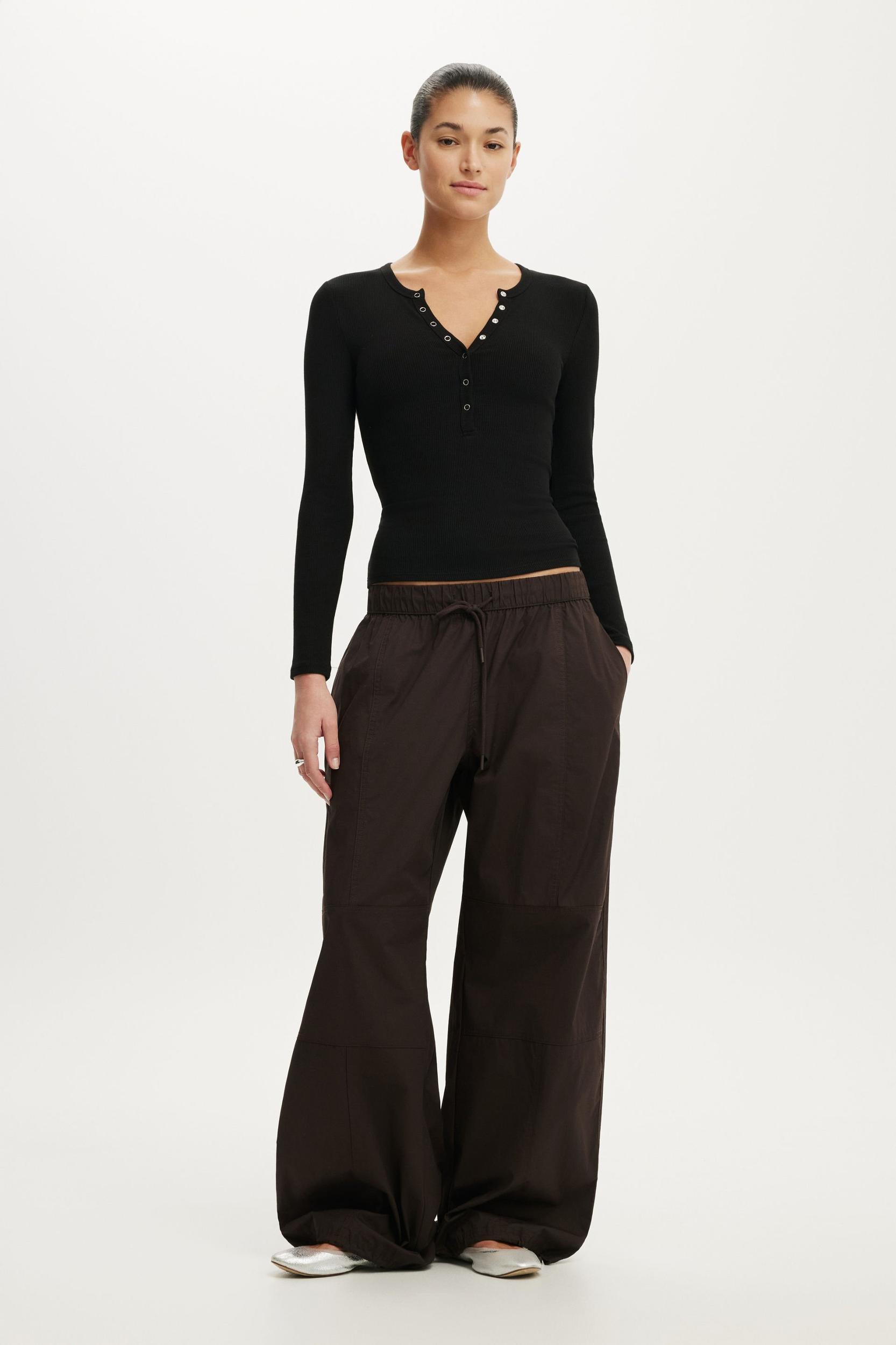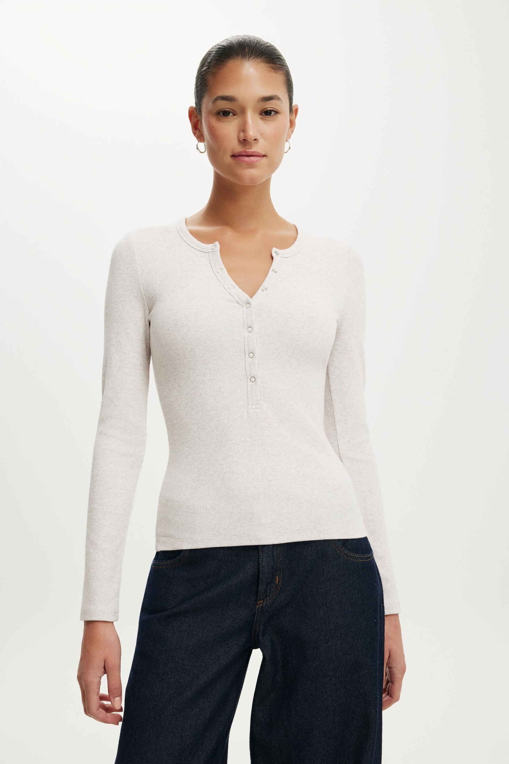 Long Sleeve ,Crew neckline ,Rib fabrication Henley ,Snaps at front ,Longline