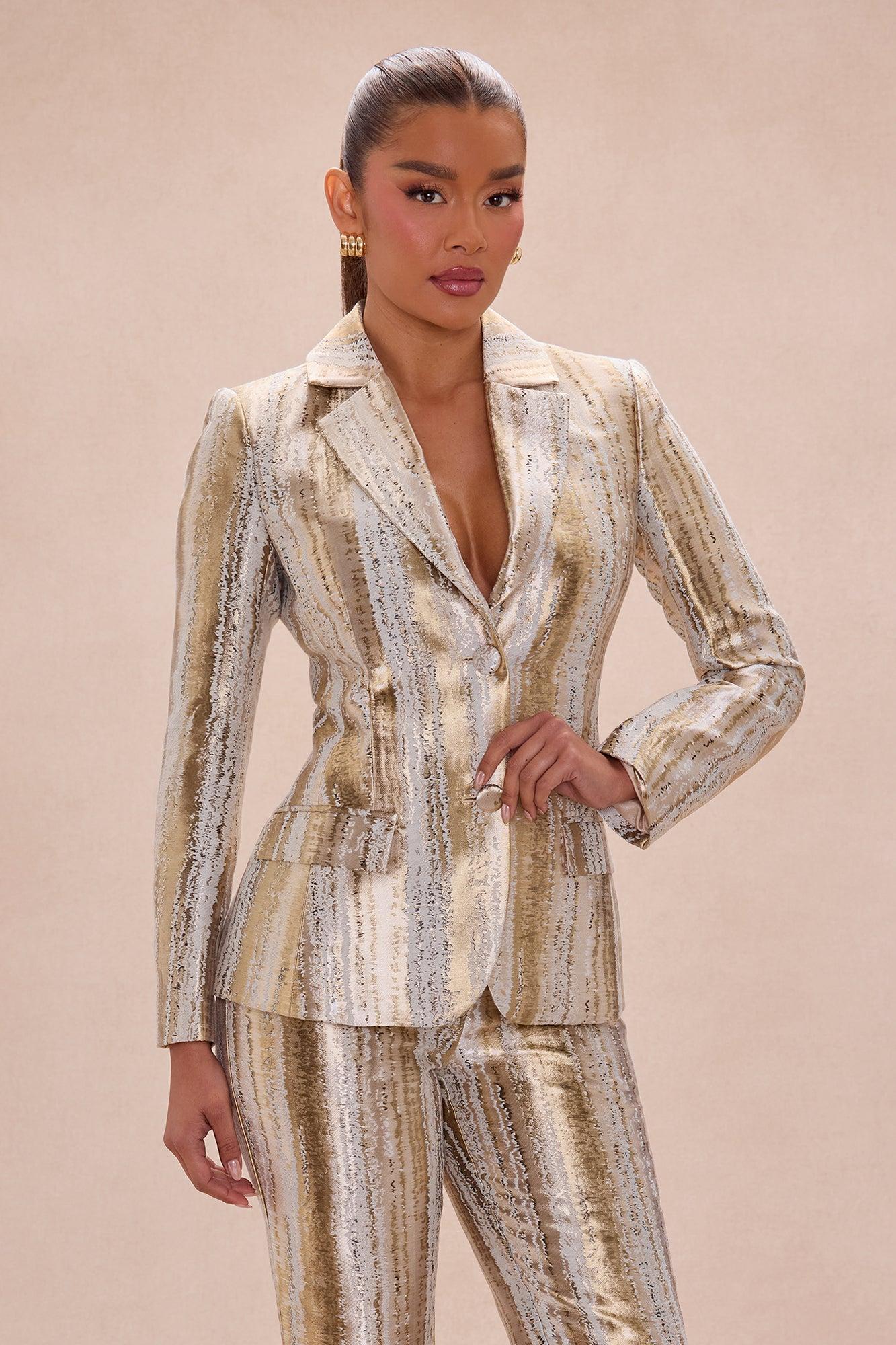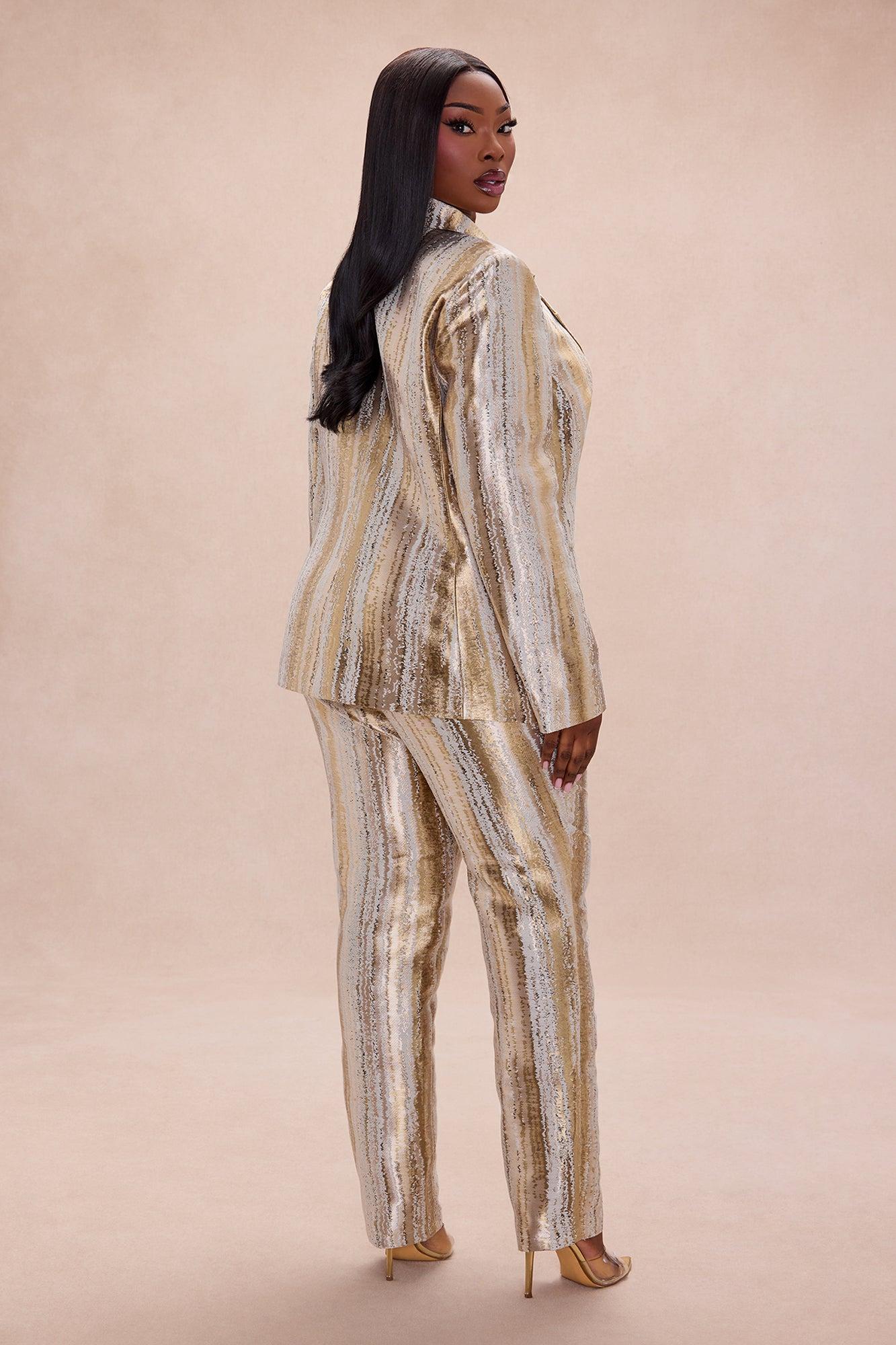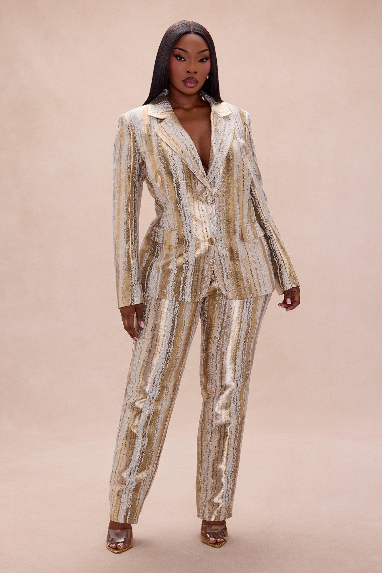 Available In Gold/combo. Jacquard Suit Ensemble Long Sleeve Blazer with Shoulder Pads Collared Faux Pockets Front Button Closure Lined Non Stretch Pant with Pockets Front Hook And Zipper Closure Non Stretch Shell: 90% Polyester 10% Metallic Fiber Lining: 100% Polyester Imported