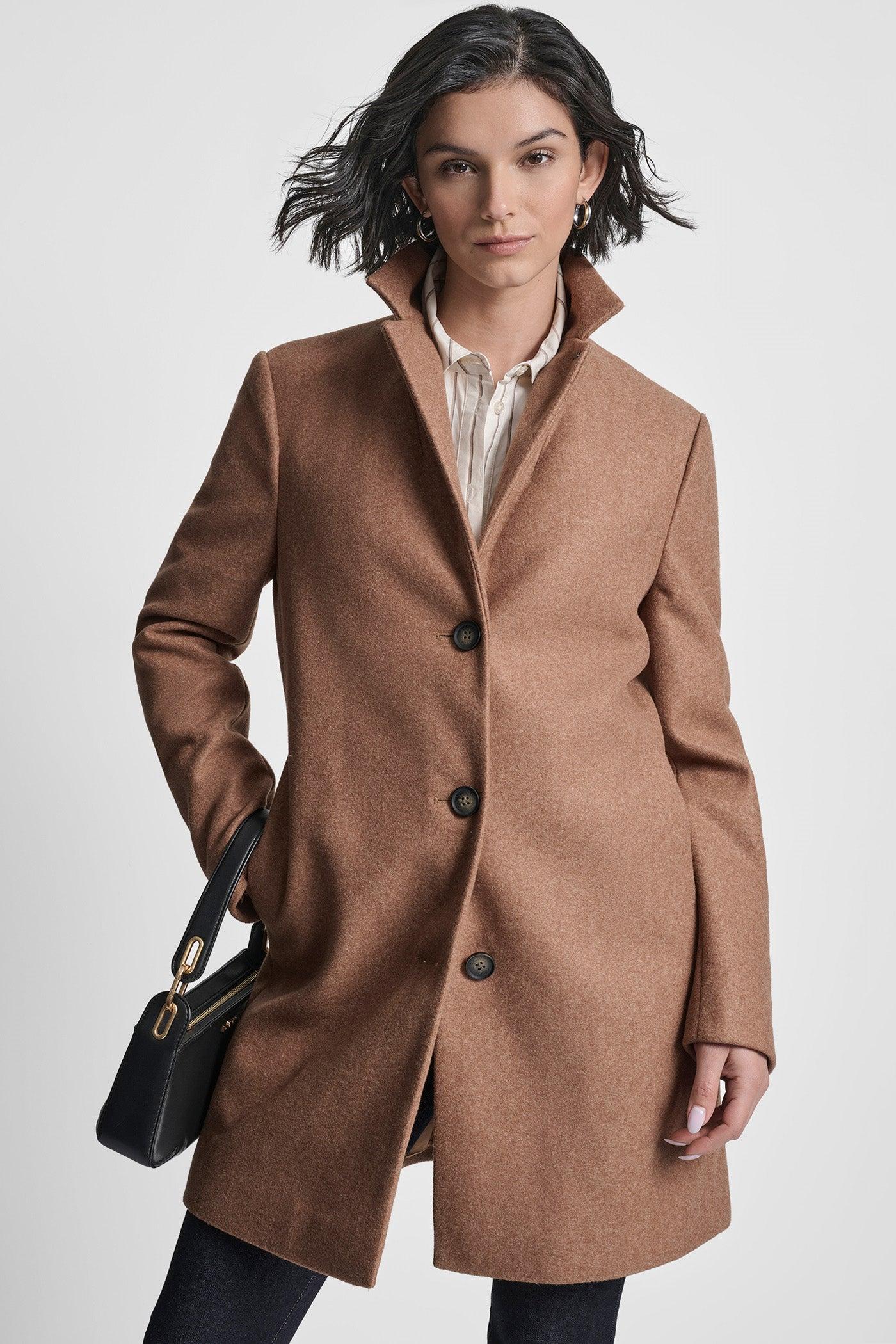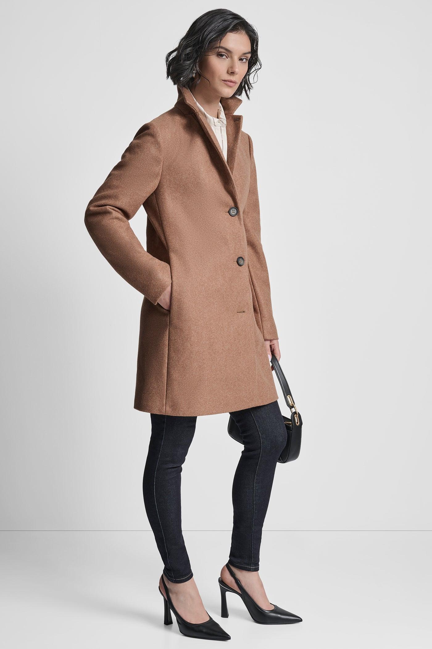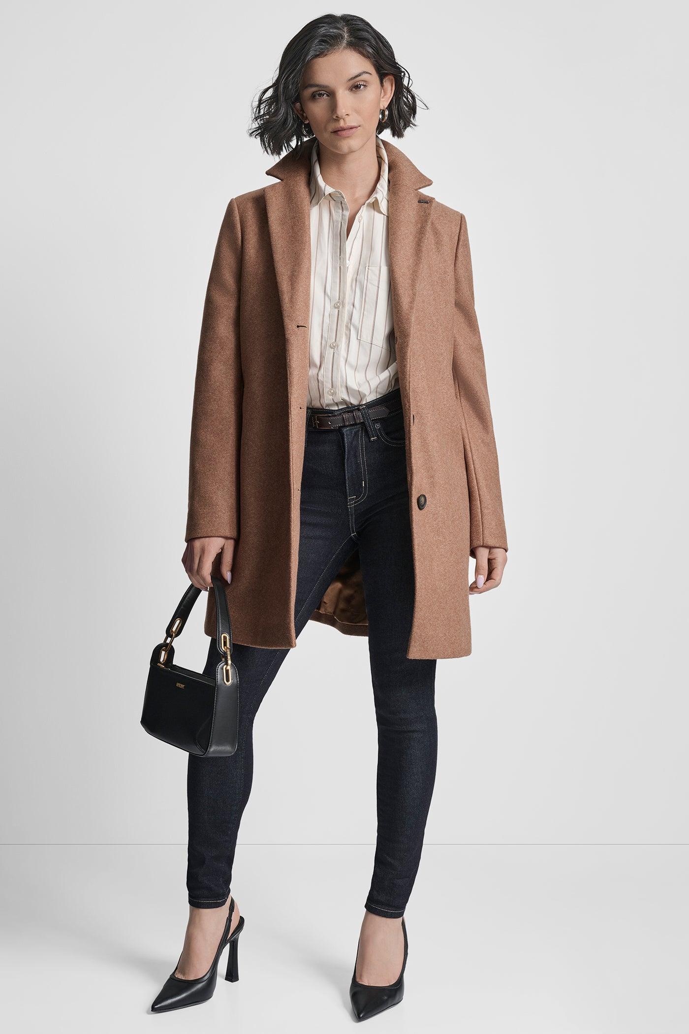 3-Button Faux Wool CoatClassic knee-length coat with timeless DKNY tailoringCrafted from 10...