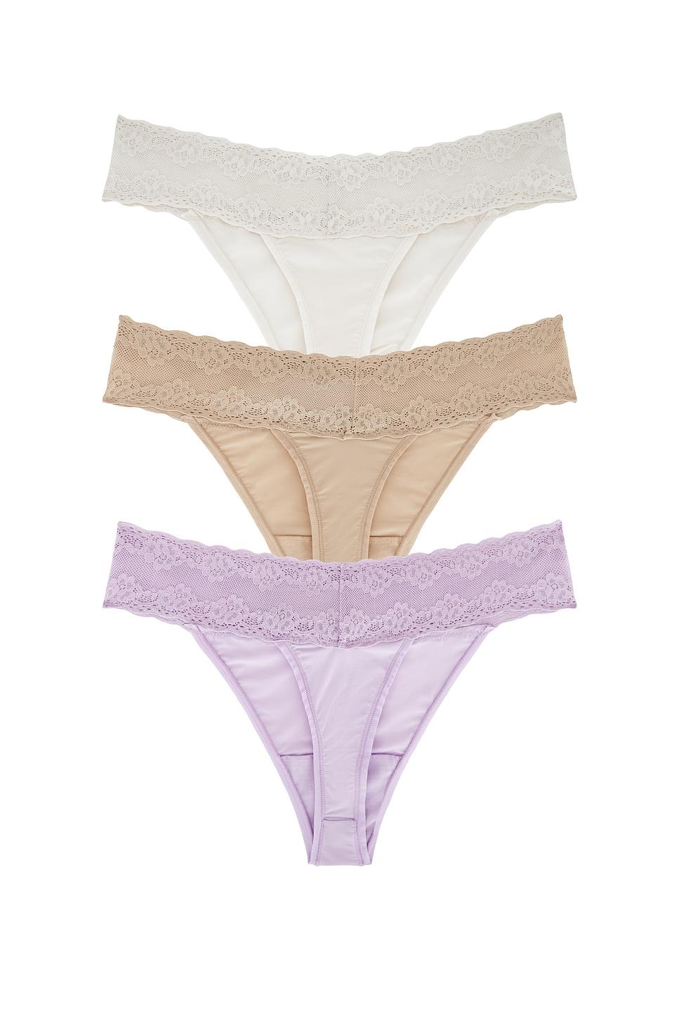 Self: 62% nylon, 38% elastaneLace: 85% nylon, 15% elastaneGusset: 100% cotton. Hand wash. Stretch jersey fabric with lace trim and thong back. Pack of 3. Made in China. Revolve Style No. NORI-WI108. Manufacturer Style No. 771154MP. One size fits most.
