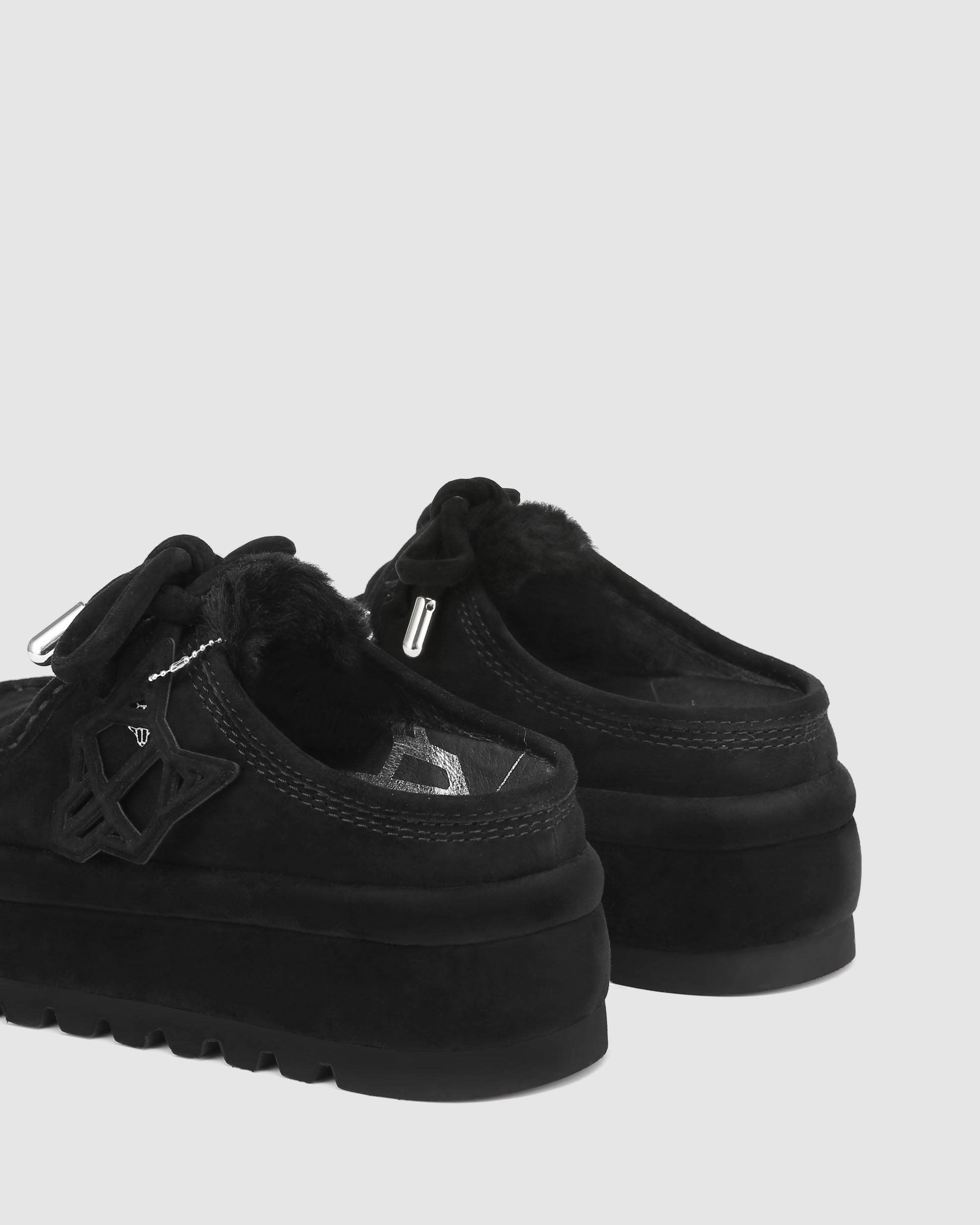 Introducing the Blizzard slip-on from Naked Wolfe, a backless shoe that combines luxury and modern comfort. Crafted from premium suede, it features a cozy wool lining and a leather sock for exceptional comfort. The shoe boasts a 60mm heel height and a chunky super light tread for an elevated look. Thick suede leather round laces with branded metal lace tips add a touch of luxury to any casual look, while an embossed logo and a big Wolfe head key chain enhance its distinctive design. Perfect for making a statement, the Blizzard slip-on is a must-have addition to your footwear collection
