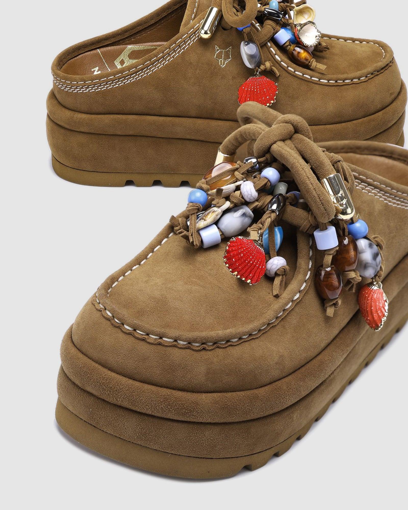 Introducing the Blizzard slip-on from Naked Wolfe, a backless shoe that combines luxury and modern comfort. Crafted from premium suede, it features a cozy wool lining and a leather sock for exceptional comfort. The shoe boasts a 60mm heel height and a chunky super light tread for an elevated look. Thick suede leather round laces with branded metal lace tips add a touch of luxury to any casual look, while an embossed logo and a big Wolfe head key chain enhance its distinctive design. This specific pair features shell charm detailing attached at the front. Each pair has a hand crafted dirty finish. Perfect for making a statement, the Blizzard slip-on is a must-have addition to your footwear collection