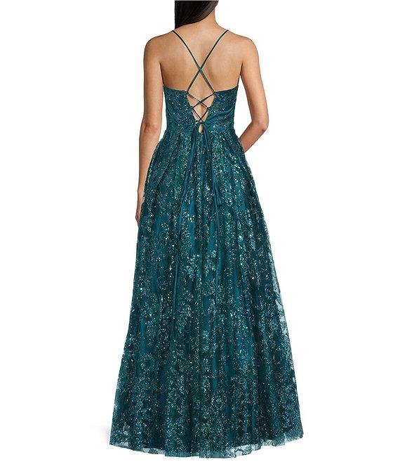 Blondie Nites Glitter Pattern V-Neck Spaghetti Straps Corset Tie-Back Gown