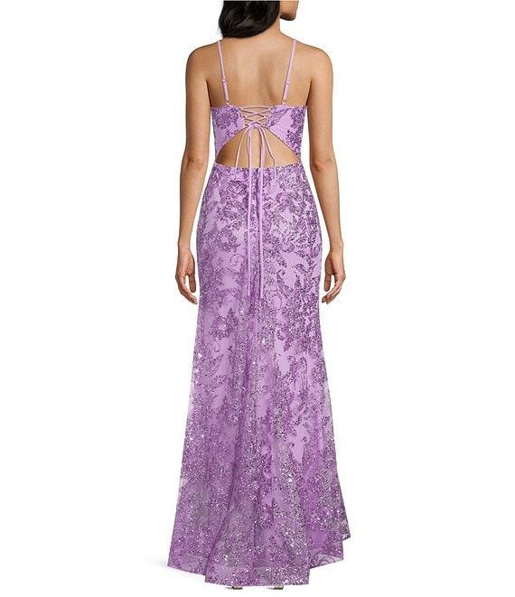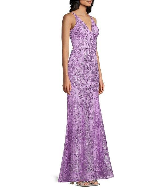 Blondie Nites Glitter Sequined Leaf Pattern V-Neck Sleeveless Tie Back Gown