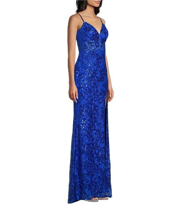 From Blondie Nites, this dress features: V-neckSleevelessAllover solid lace Adjustable spaghetti strapsStrap tie backSlit leg opening Approx. 61"LinedPolyester/spandexSpot cleanImported.