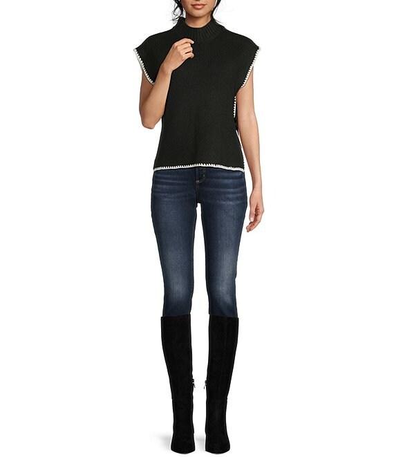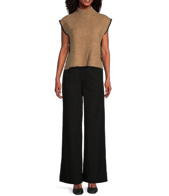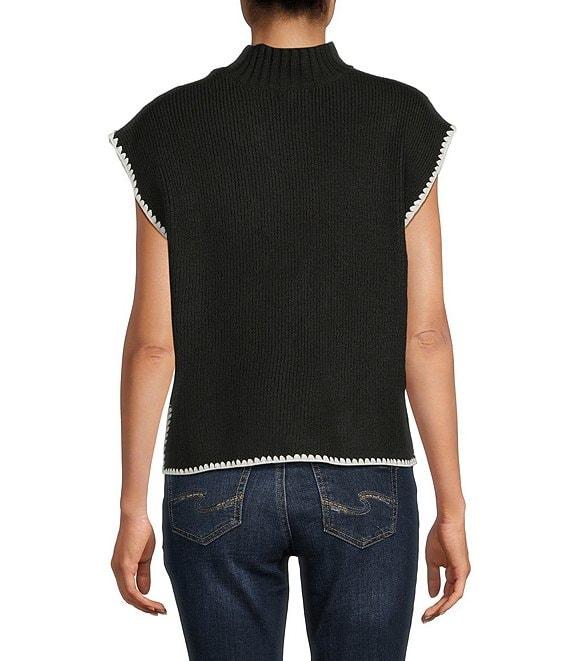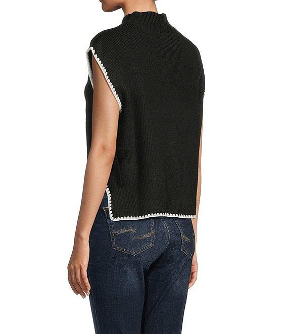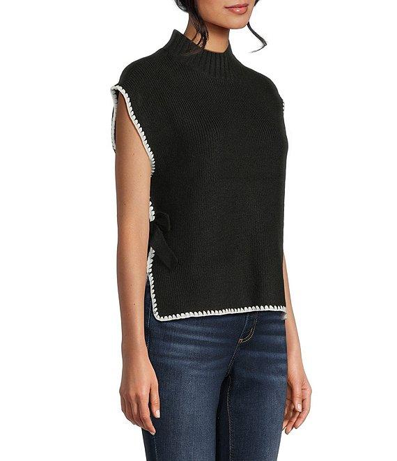 From Blu Pepper, this sweater features: Mock neckline Sleeveless Contrast stitching Side ties Pullover styling Acrylic/polyester/spandex Hand wash/line dry Imported.