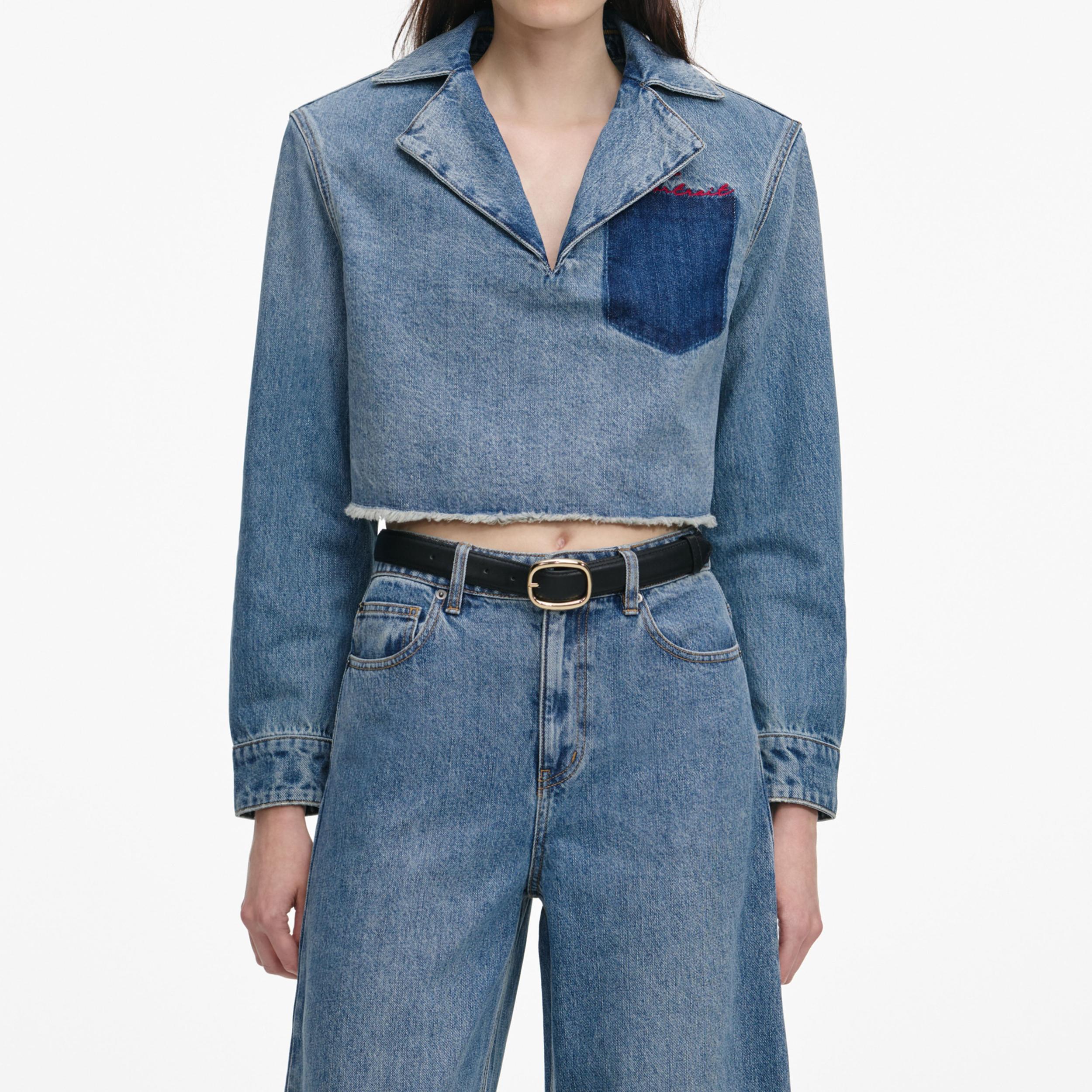 Structured with removable shoulder pads, this embroidered denim shirt adds a stylish edge to your wardrobe. Pair its cropped fit with jeans for weekend brunch or add a midi skirt for date night.True to sizeBoxy fitRemovable shoulder padsCropped cutEmbroidery detailModel is 5ft10/178cm and wears a size UK 6