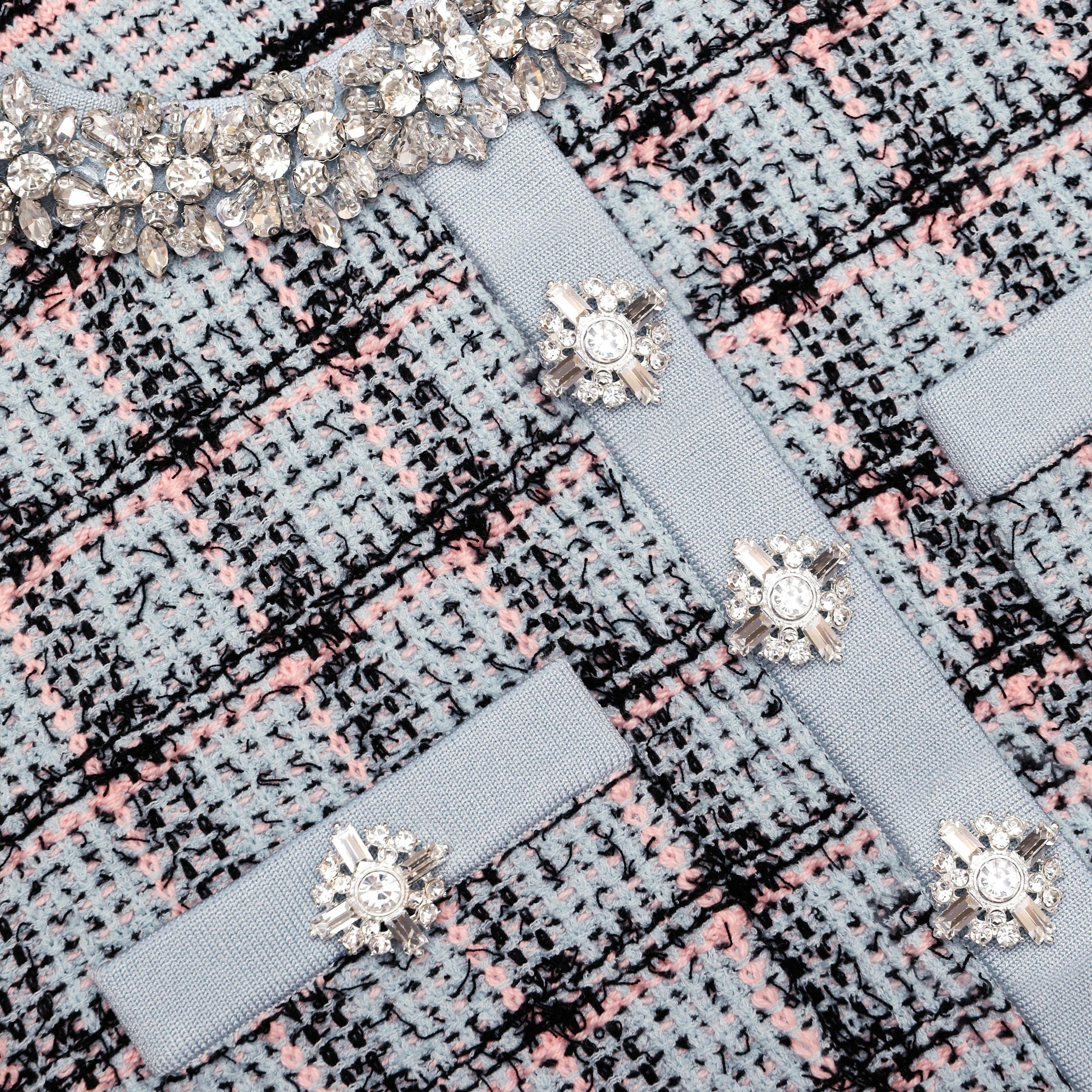 Bright and playful, textured knit meets a kaleidoscope of colours in this blue check mini skirt. Diamanté buttons sprinkle on extra charm – add our matching cardigan for a twist on the skirt suit.True to sizeFabric has stretchElasticated waistbandDiamanté embellishmentMatching skirt availableModel is 5ft10/178cm and wears a size S